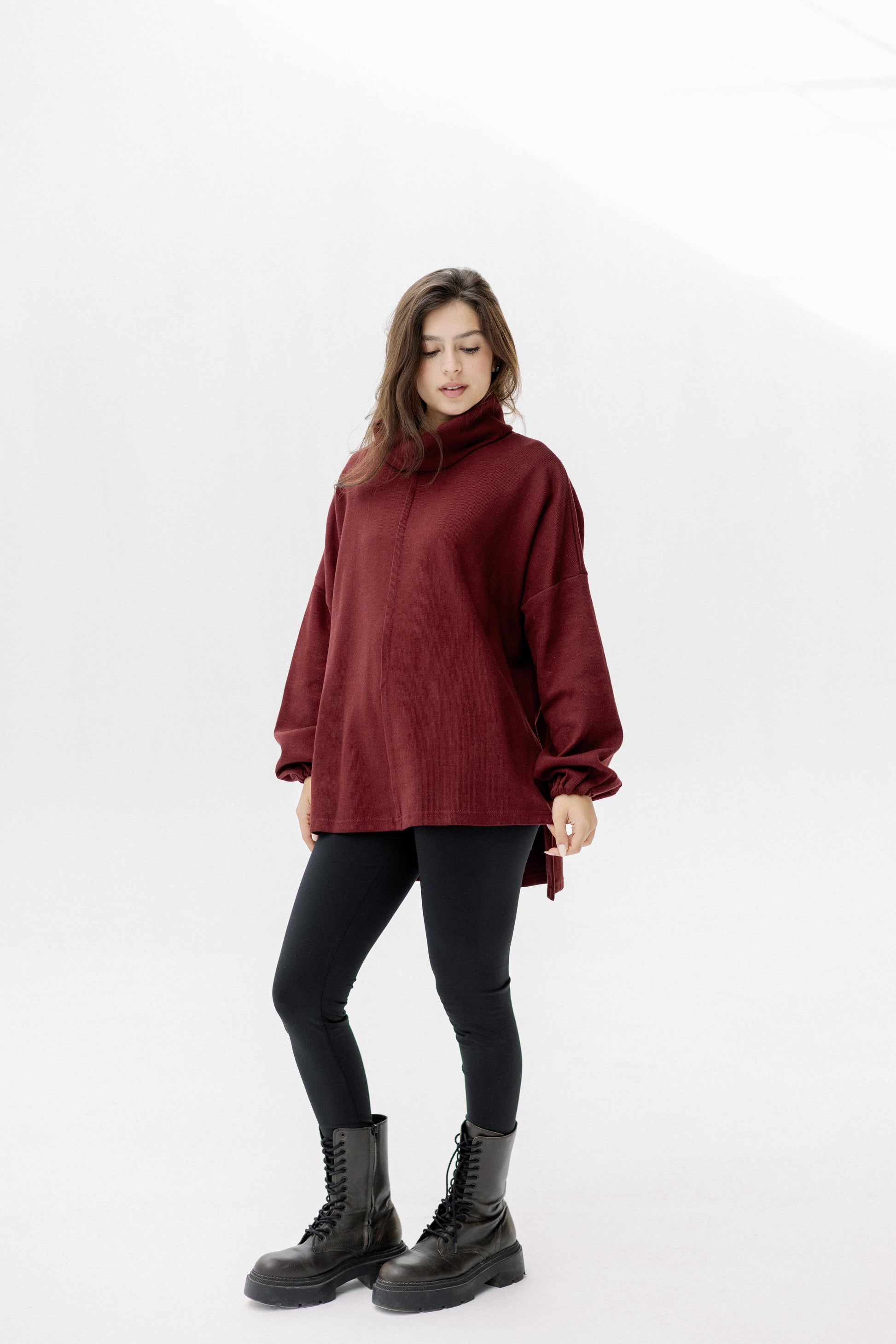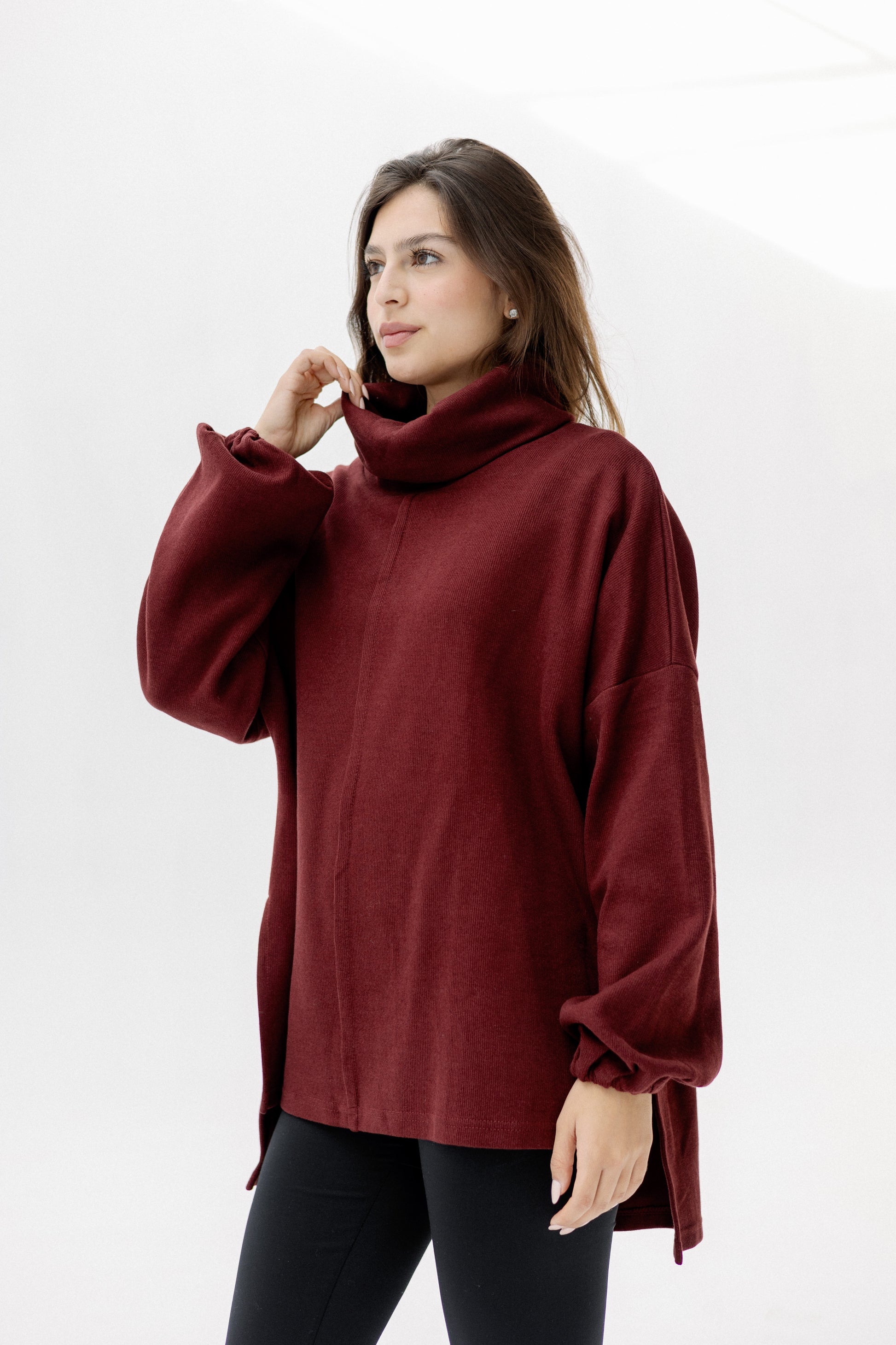 A timeless wardrobe essential with a modern silhouette. This soft turtleneck pullover features a relaxed fit and cozy feel, designed for effortless layering. Available in rich, versatile tones that pair seamlessly with any winter wardrobe. Available in: Burgundy, Olive, Black & Navy.
