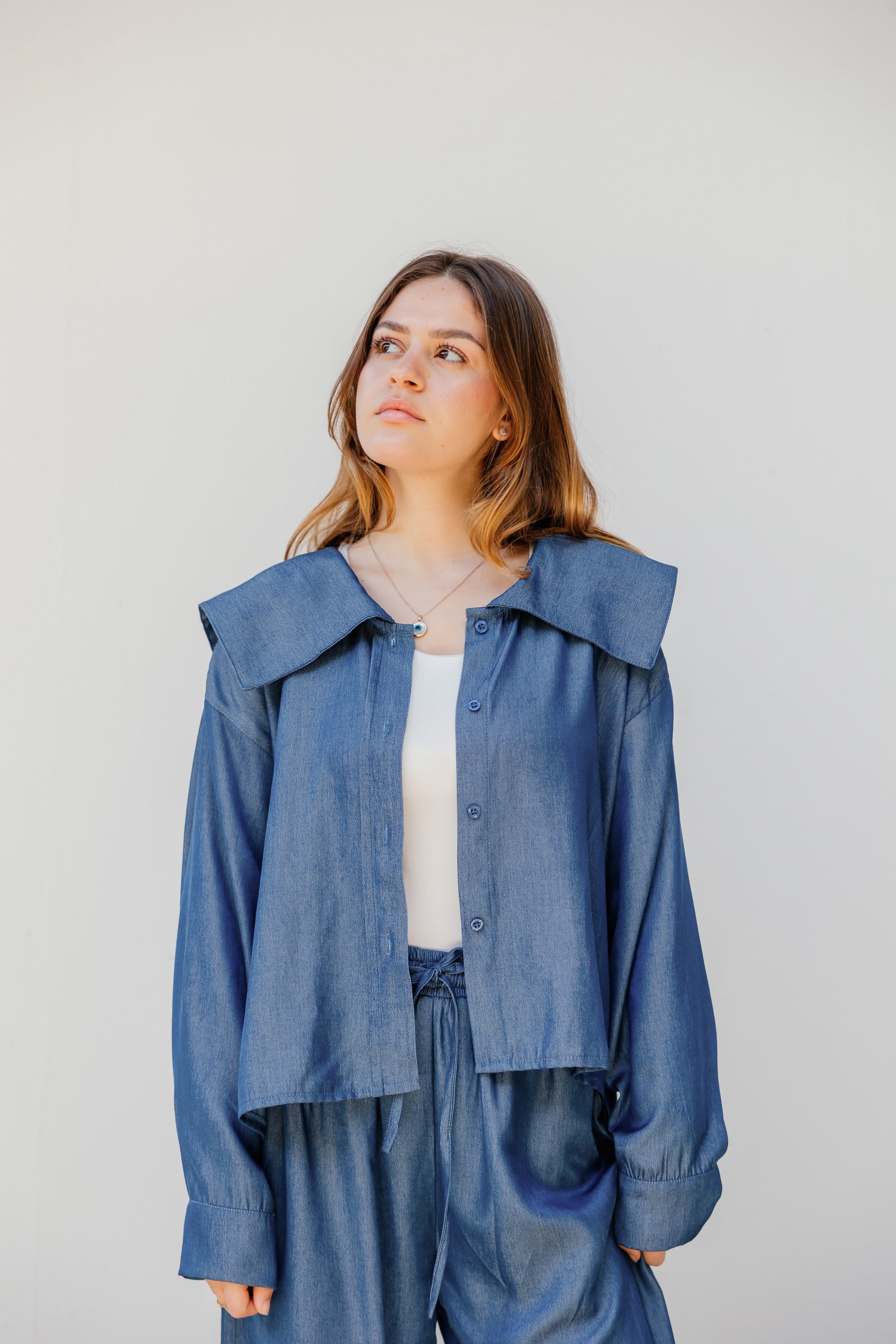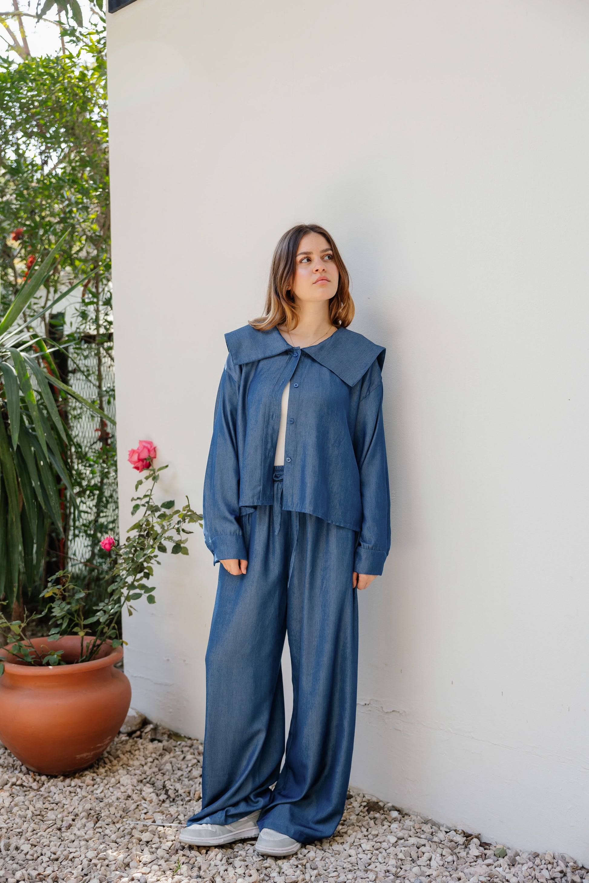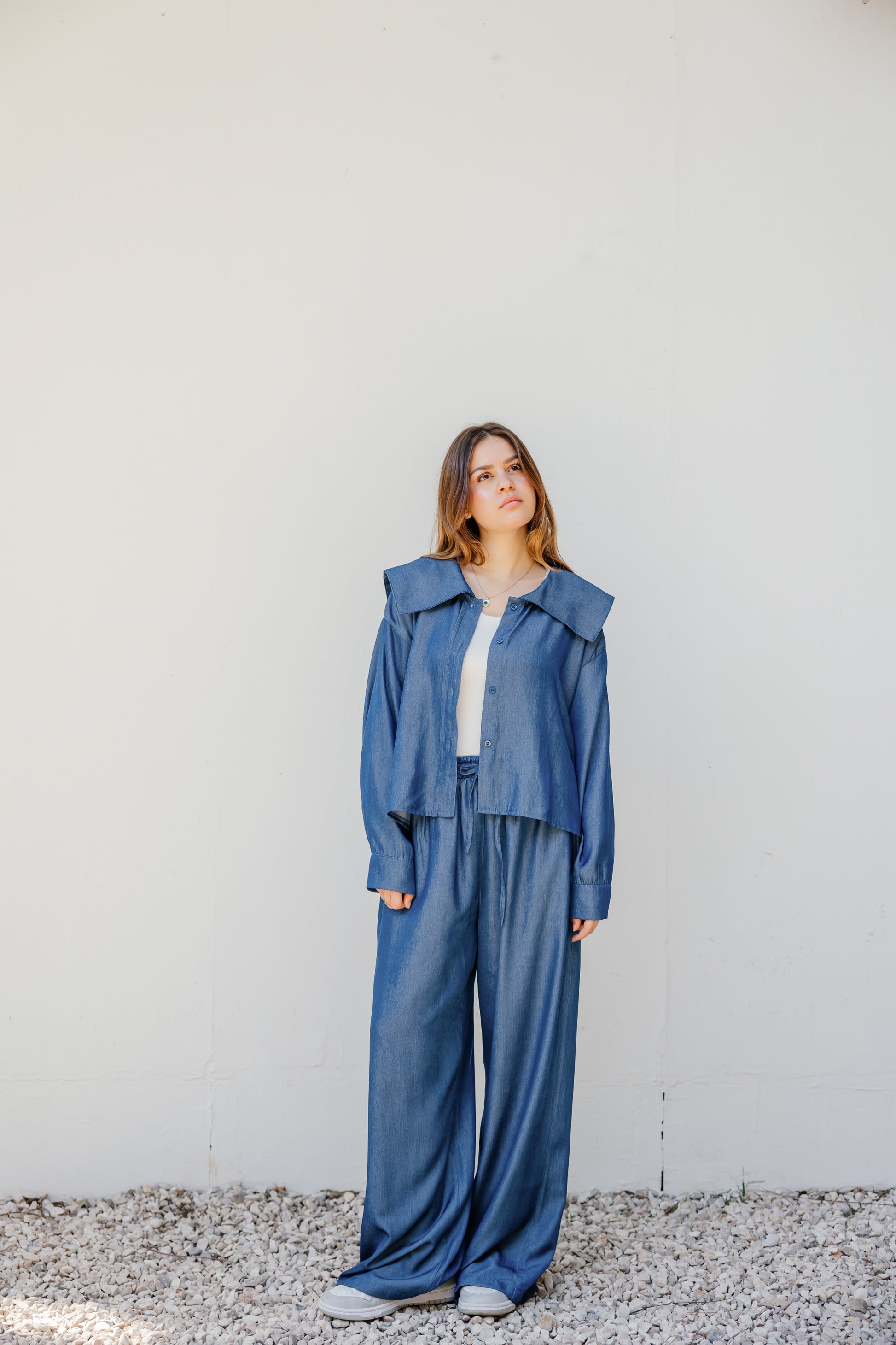 Elevate your style with this denim satin set—where edgy meets elegance in a sleek, modern look.