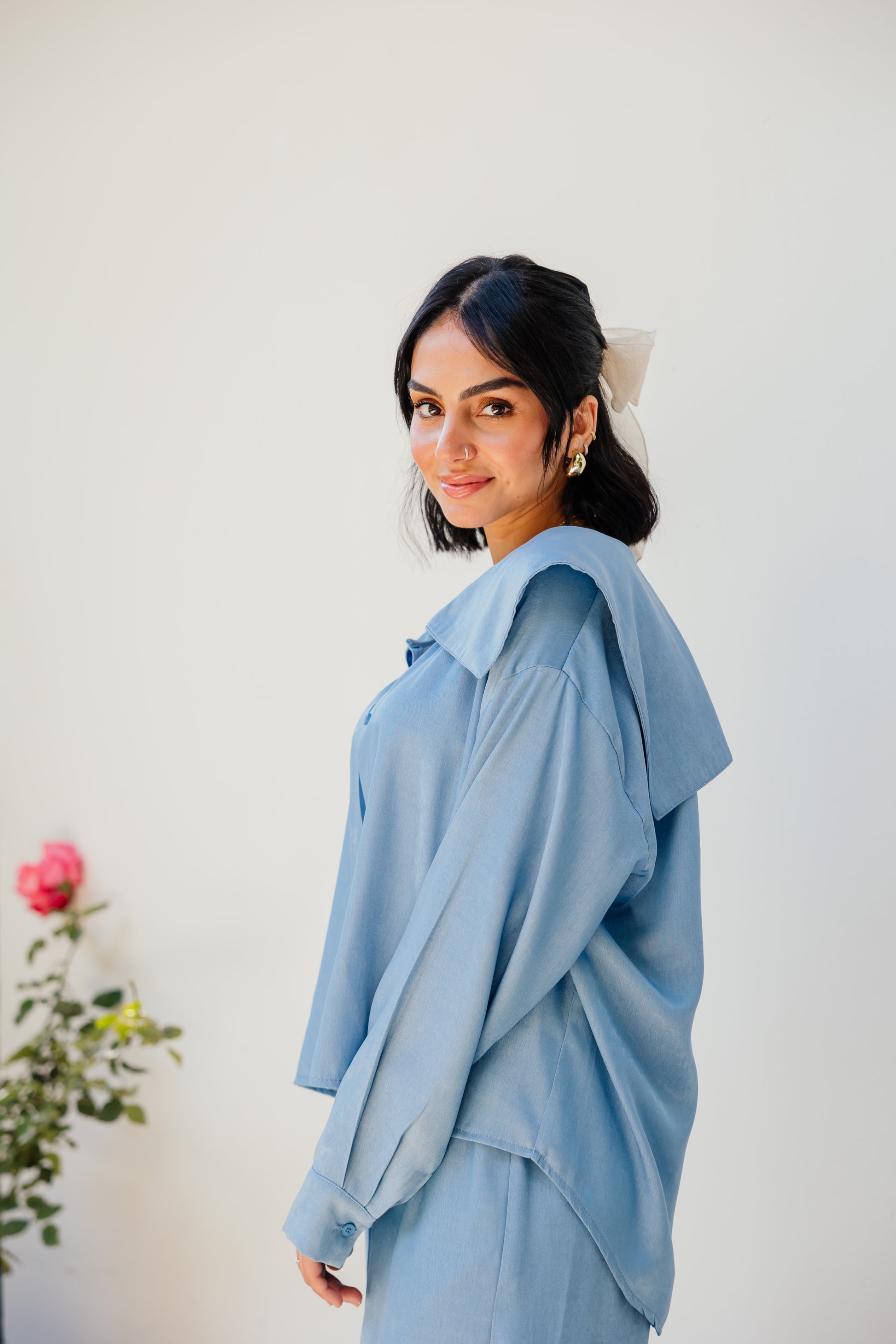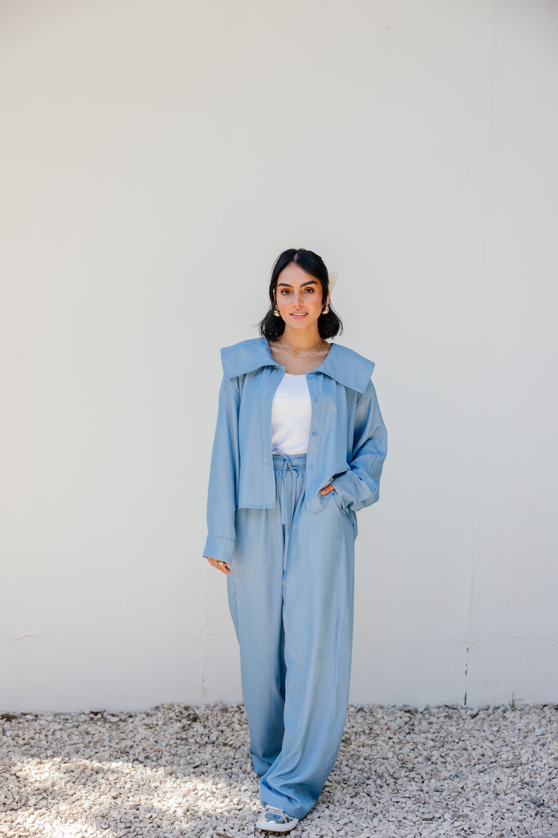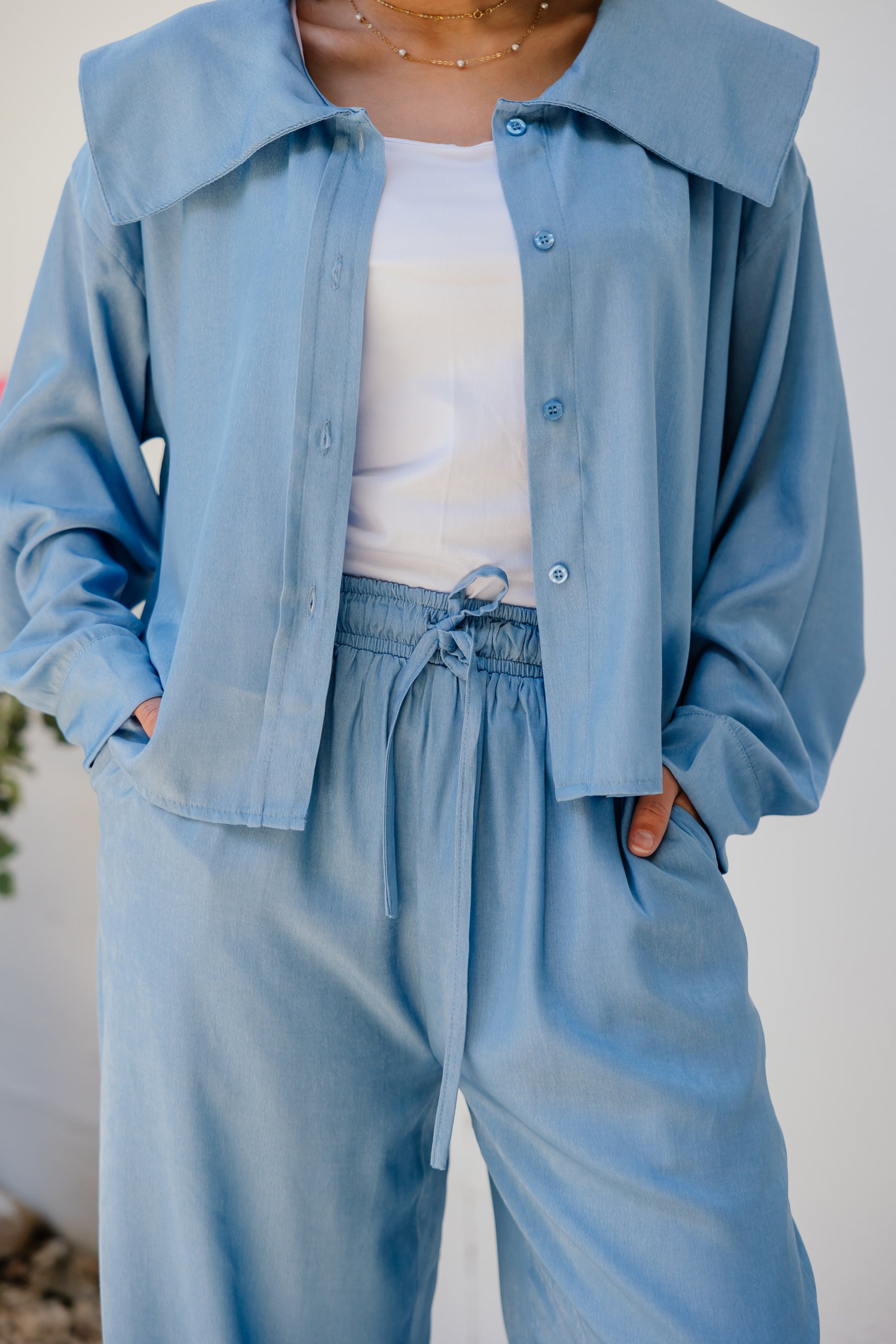 Elevate your style with this denim satin set—where edgy meets elegance in a sleek, modern look.