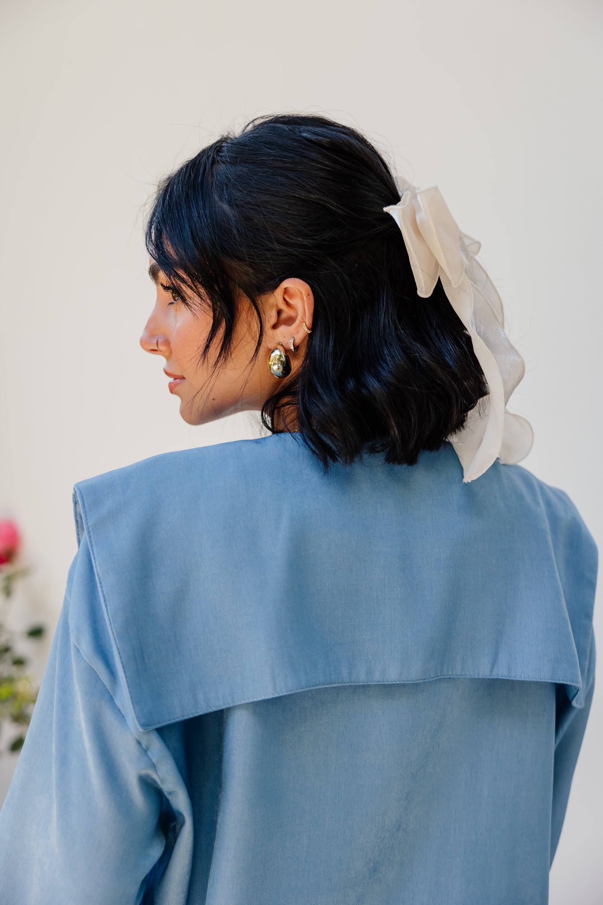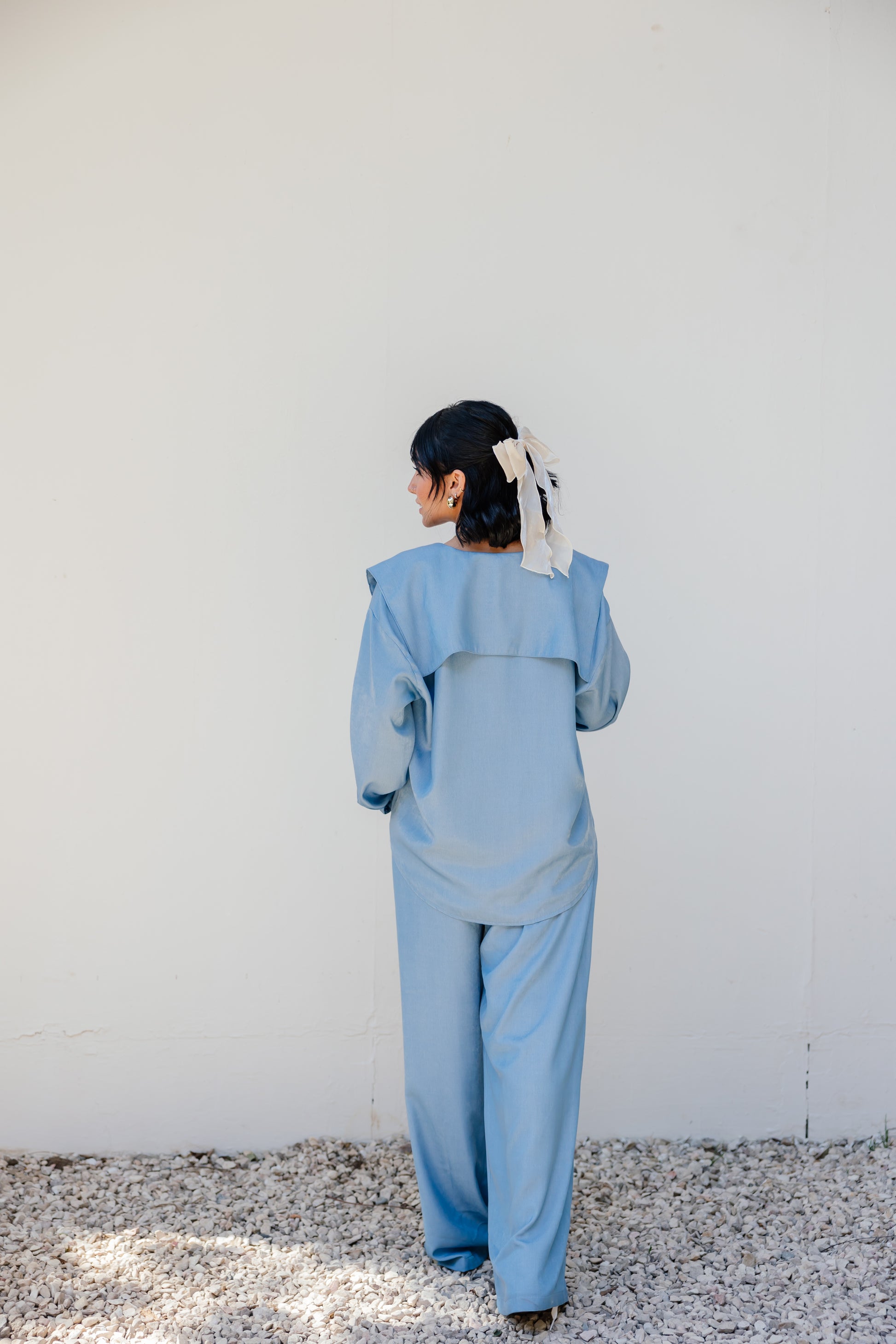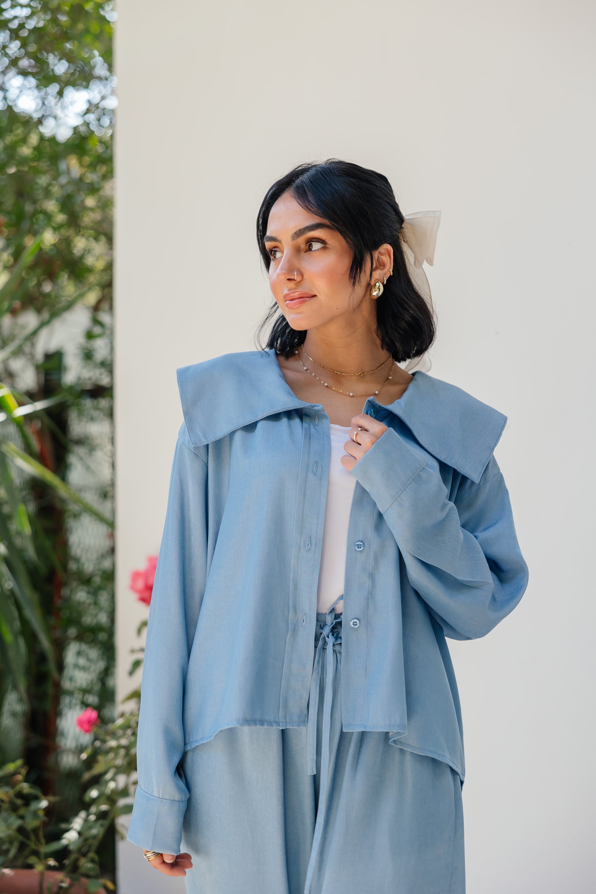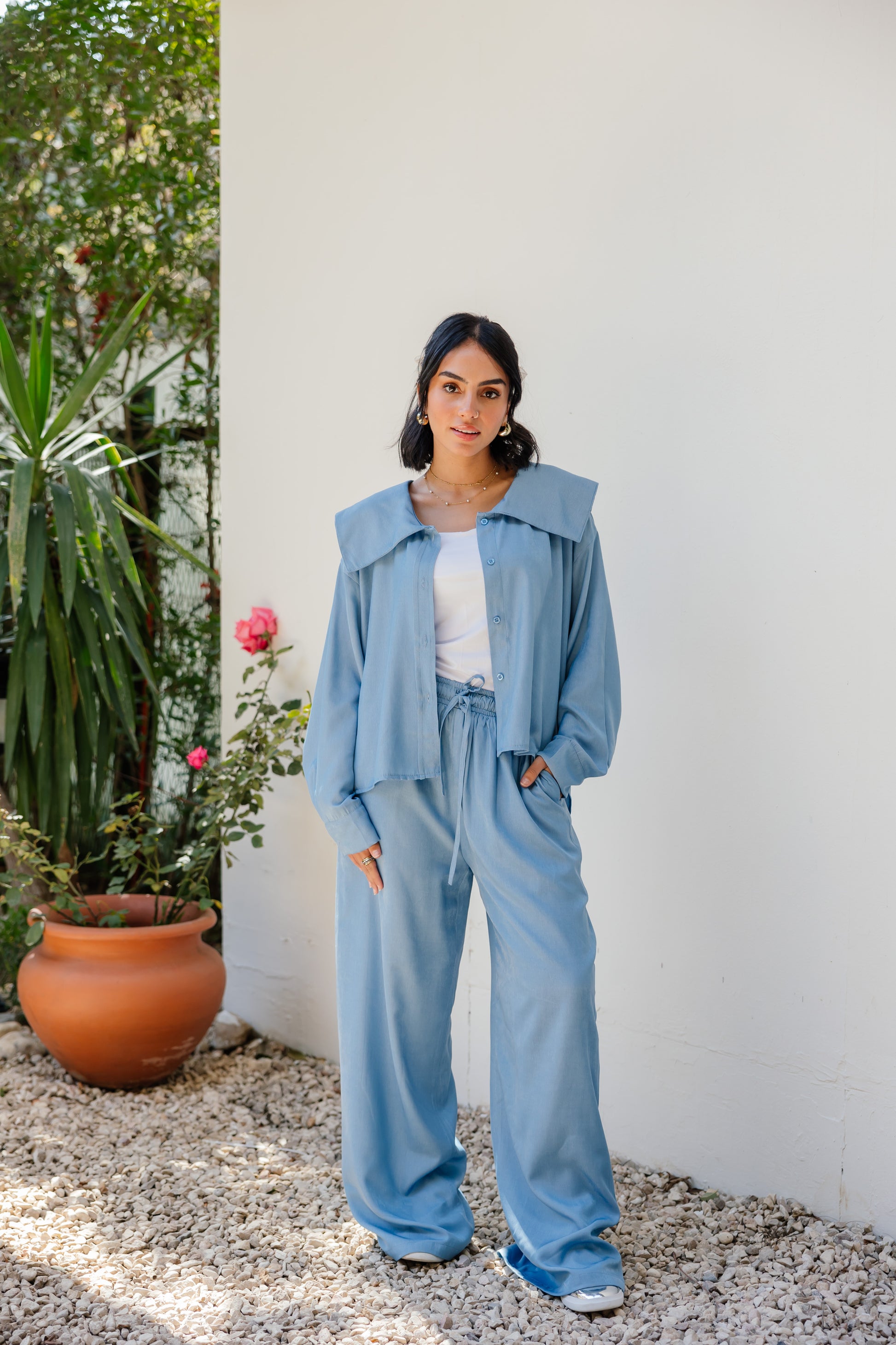 Elevate your style with this denim satin set—where edgy meets elegance in a sleek, modern look.