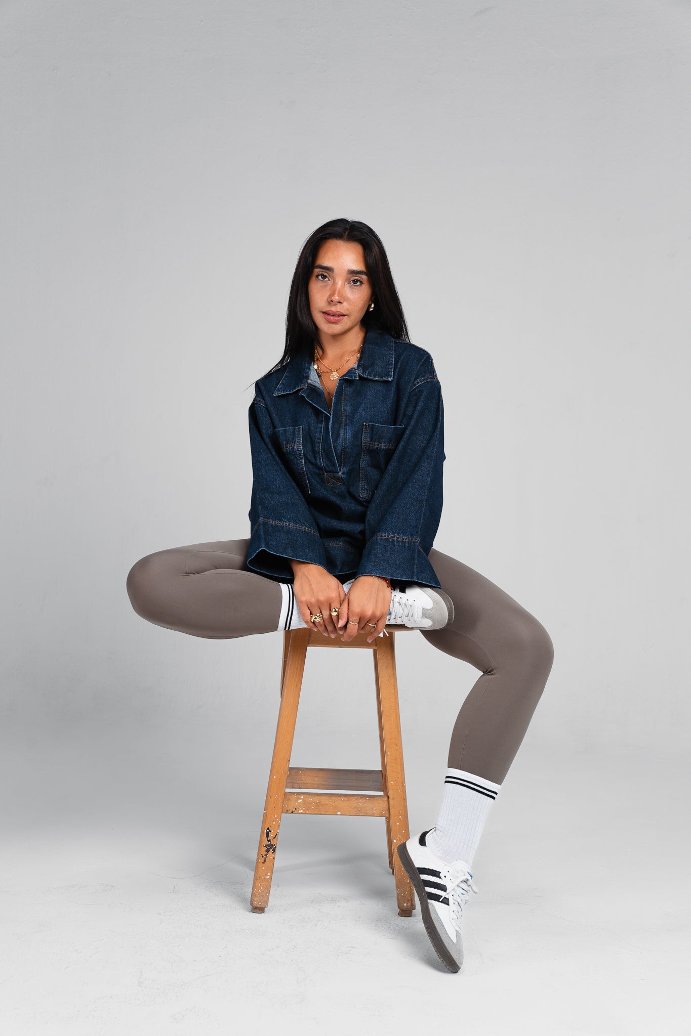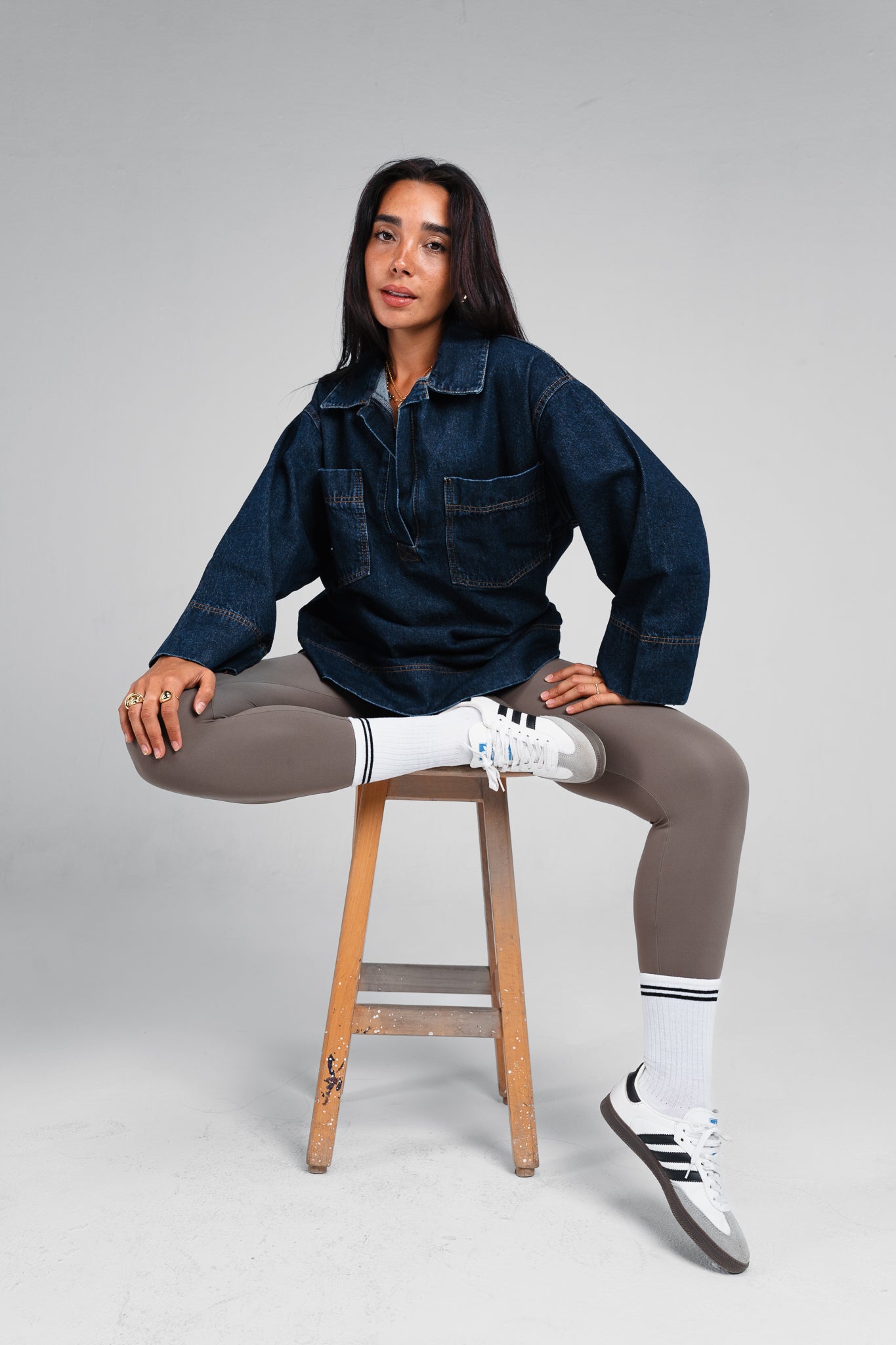 classic polo collar make it a go-to piece you can wear over leggings for a laid-back look or pair with your favorite denim for a cool, monochromatic statement.