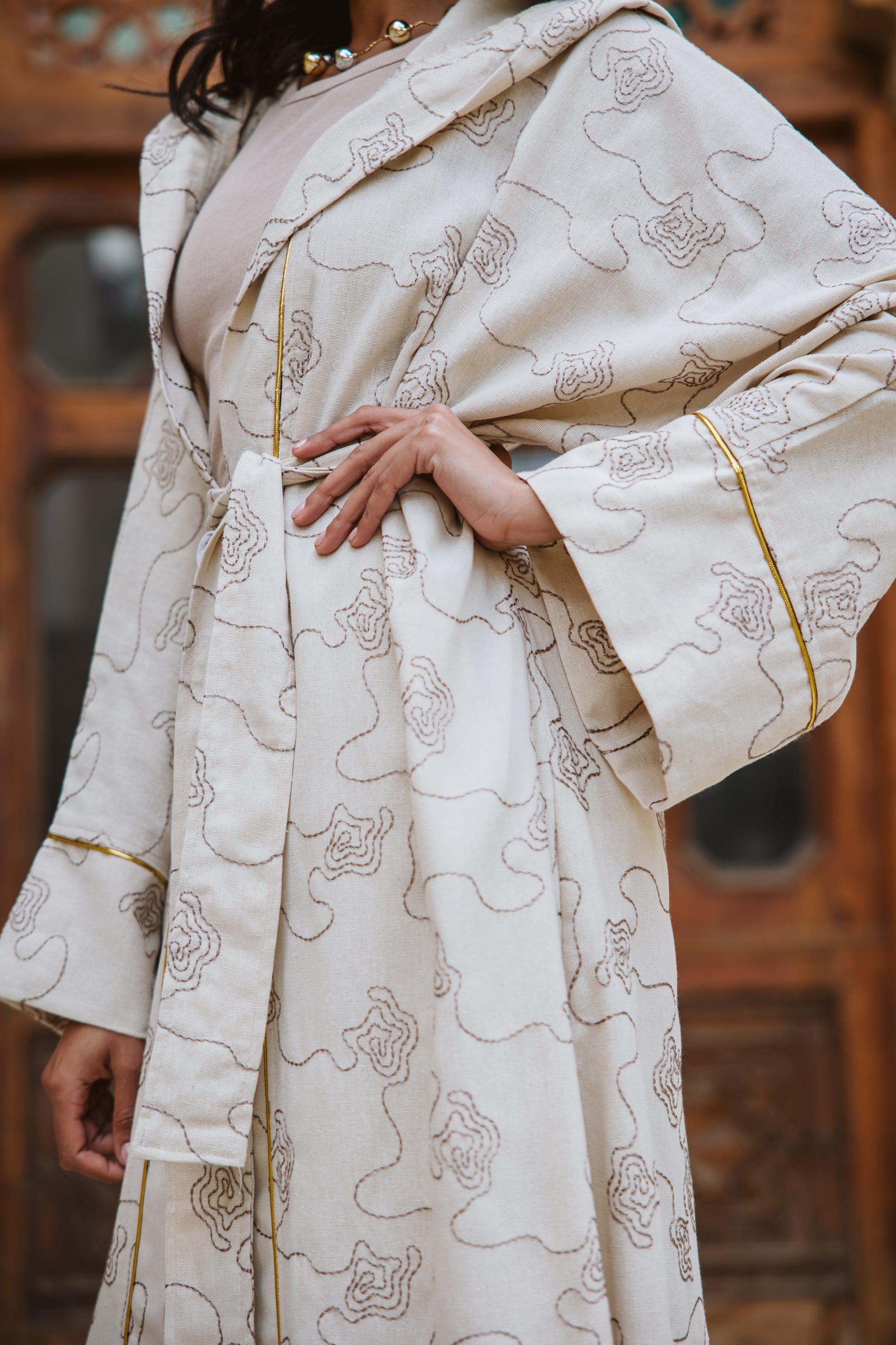 Elevate your wardrobe with this elegant embroidered kimlno, featuring intricate golden detailing and a flowing silhouette. Perfect for Ramadan gatherings or special occasions, this timeless piece blends tradition with modern sophistication.