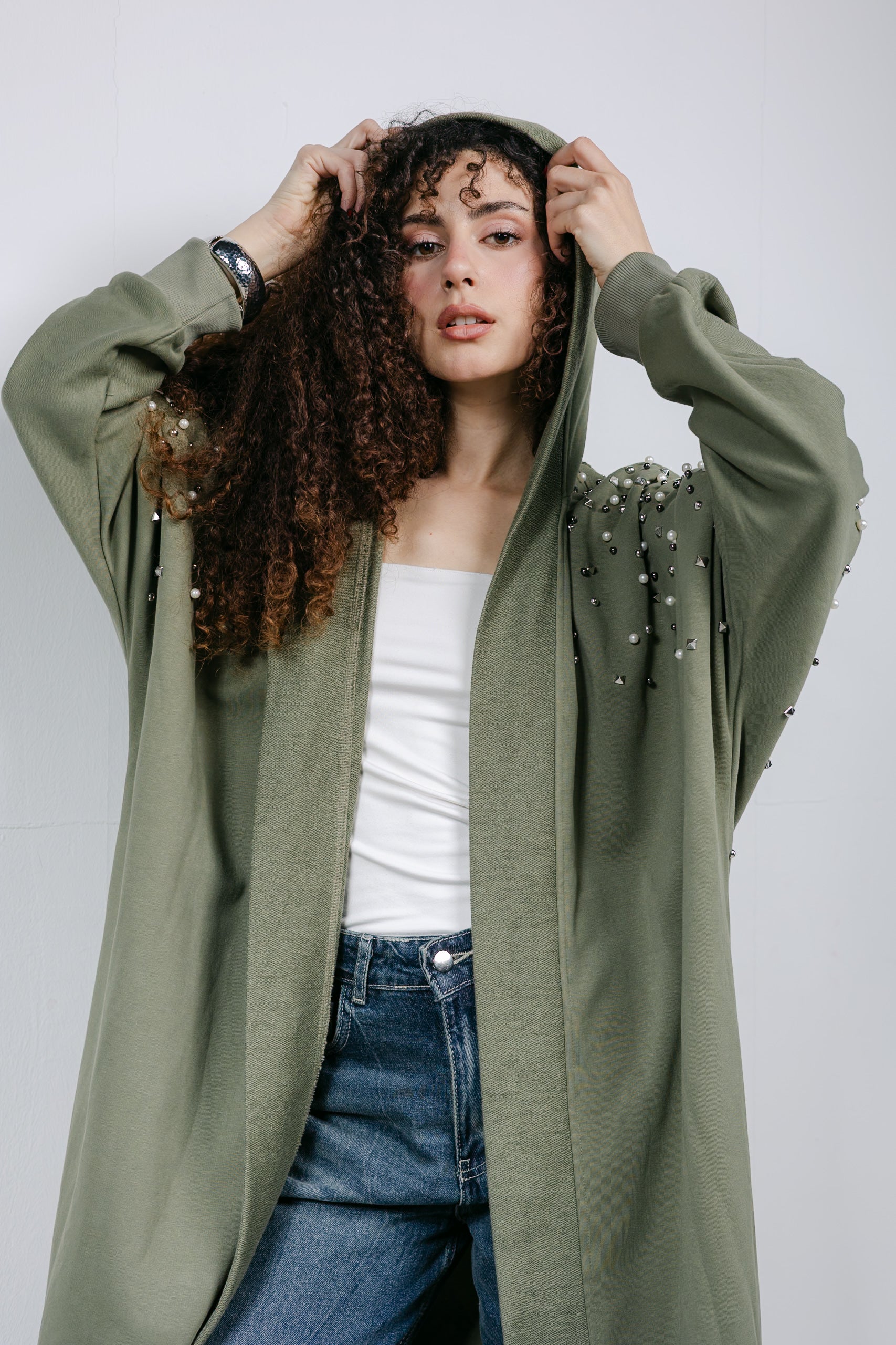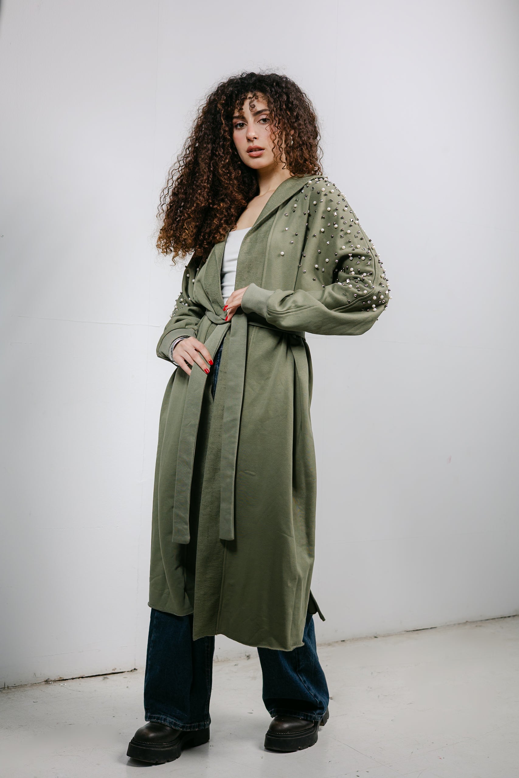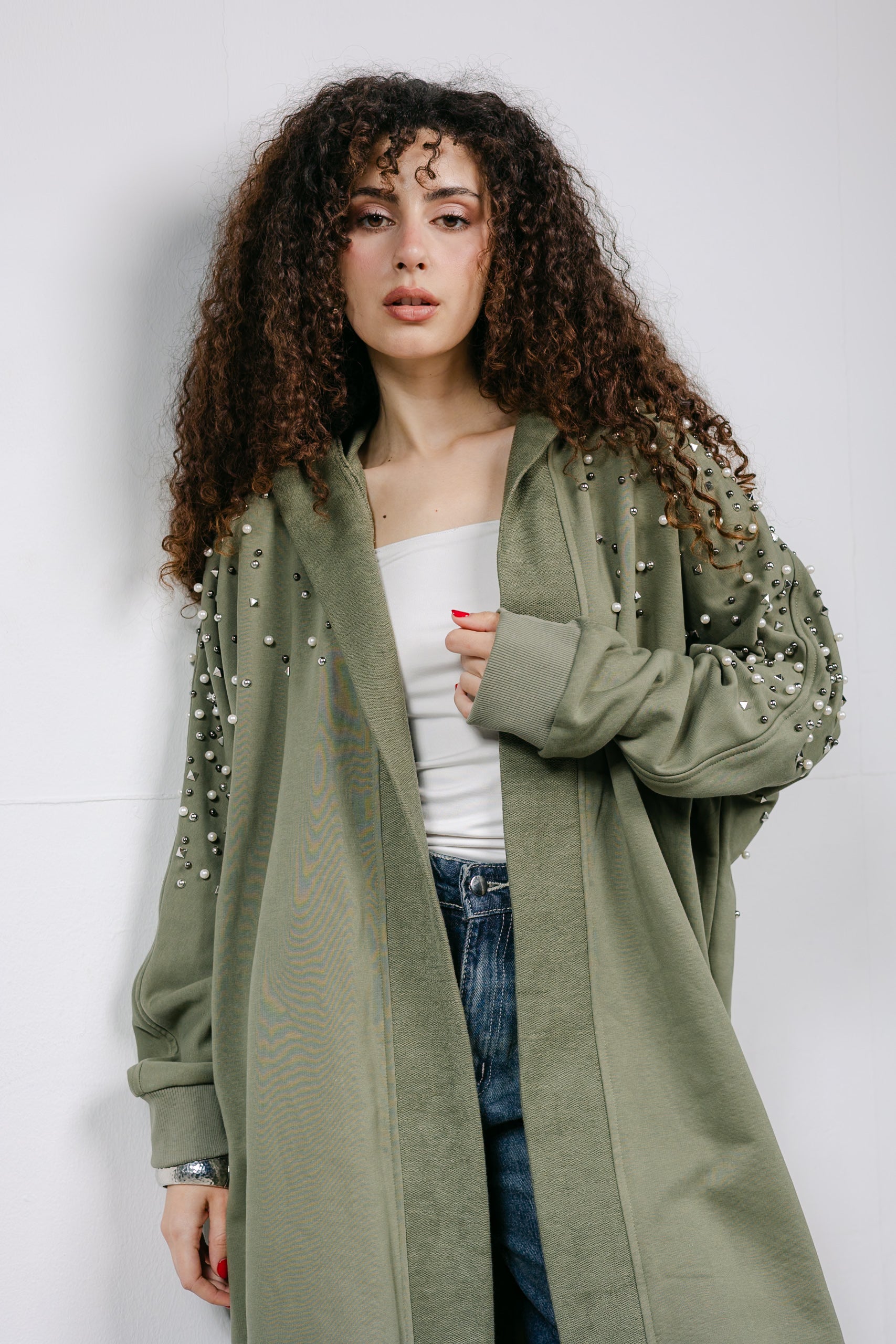 The ultimate elegant styling. This cardigan is trimmed with beautiful pearl and studded details along the shoulders, offering a classic, feminine look that pairs perfectly with denim or skirts.