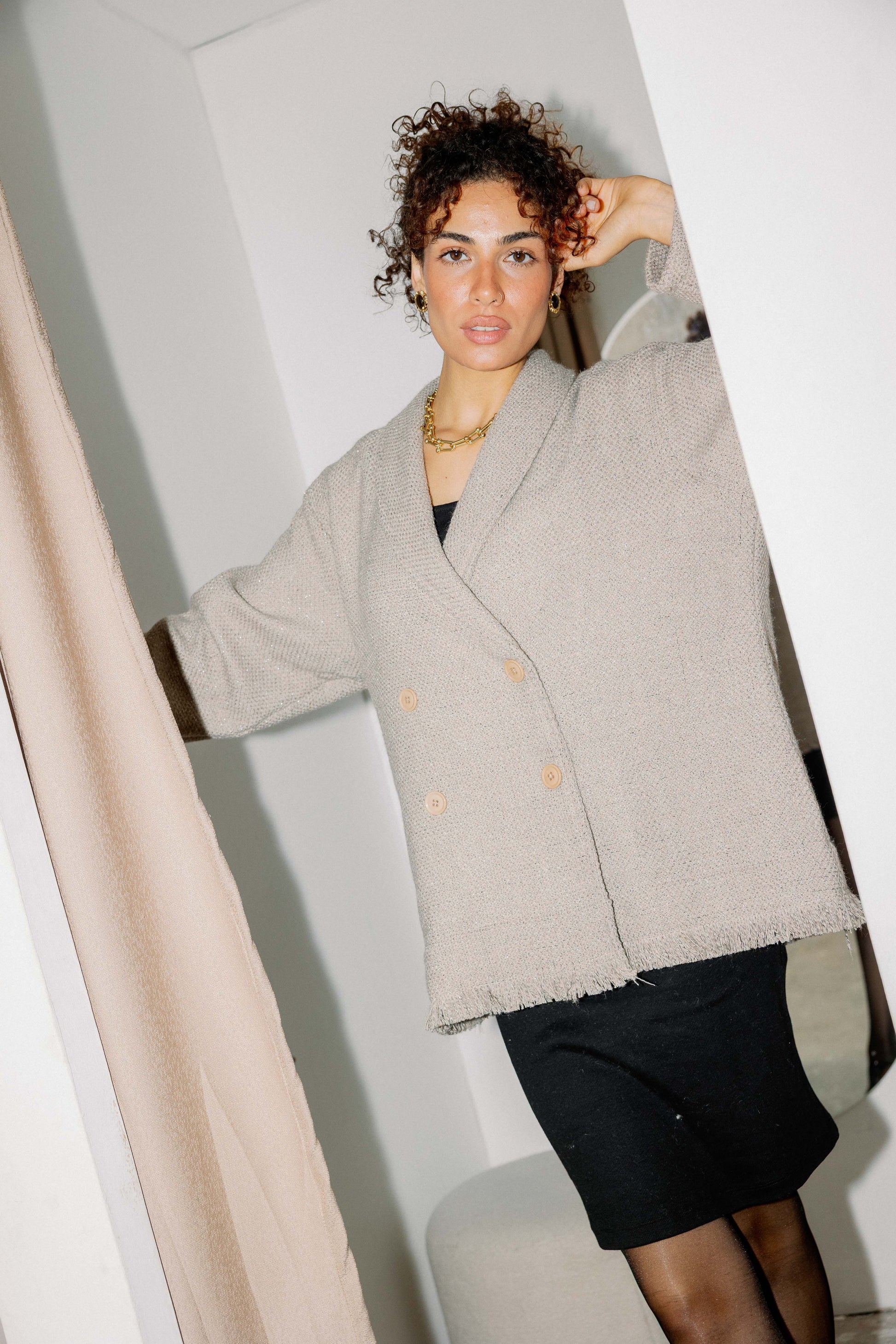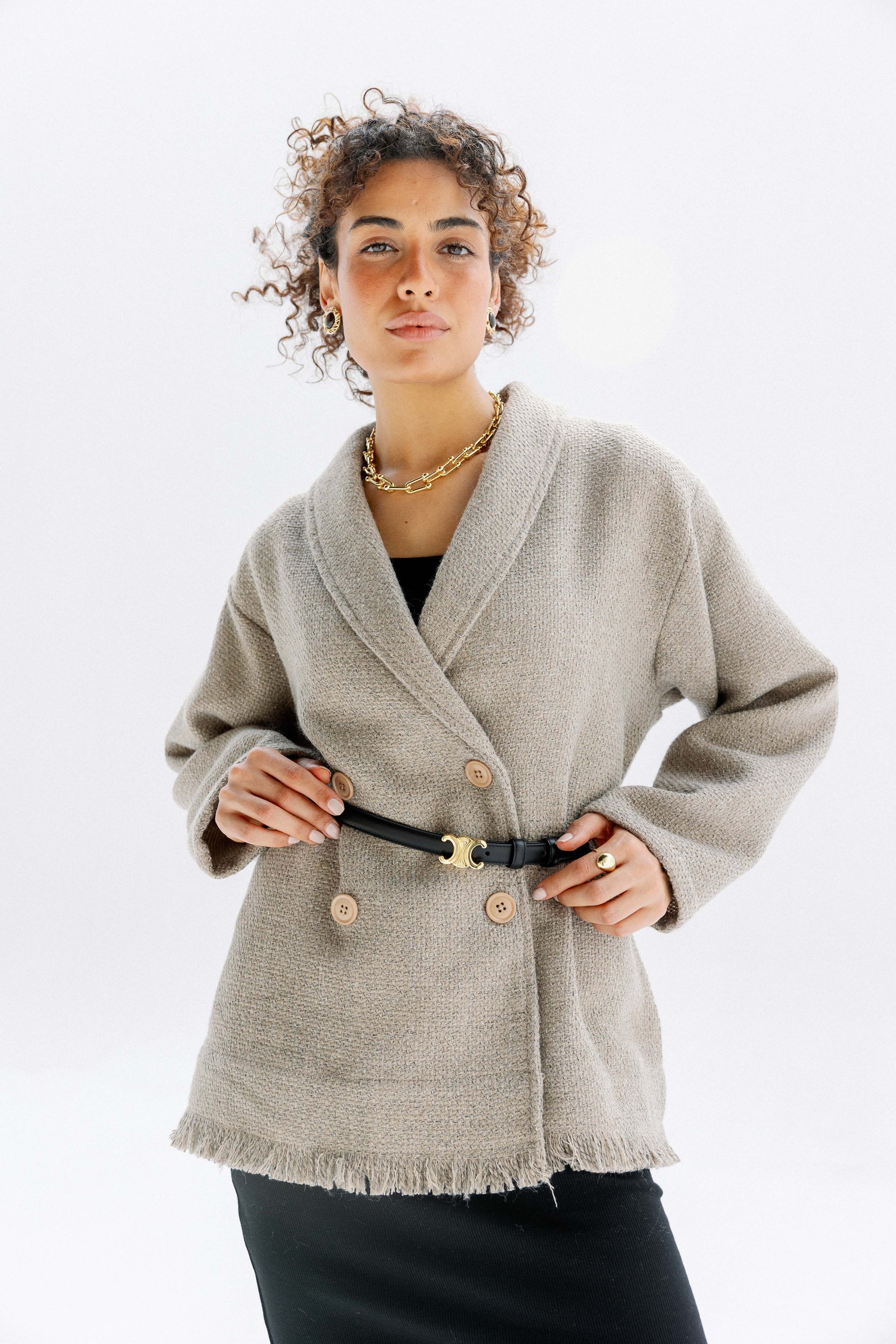 A tailored classic with a twist. The Little Secret Jacket, made from a cozy wool-blend fabric, features elegant button detailing and comes in Brown, Dark Grey, and Beige.