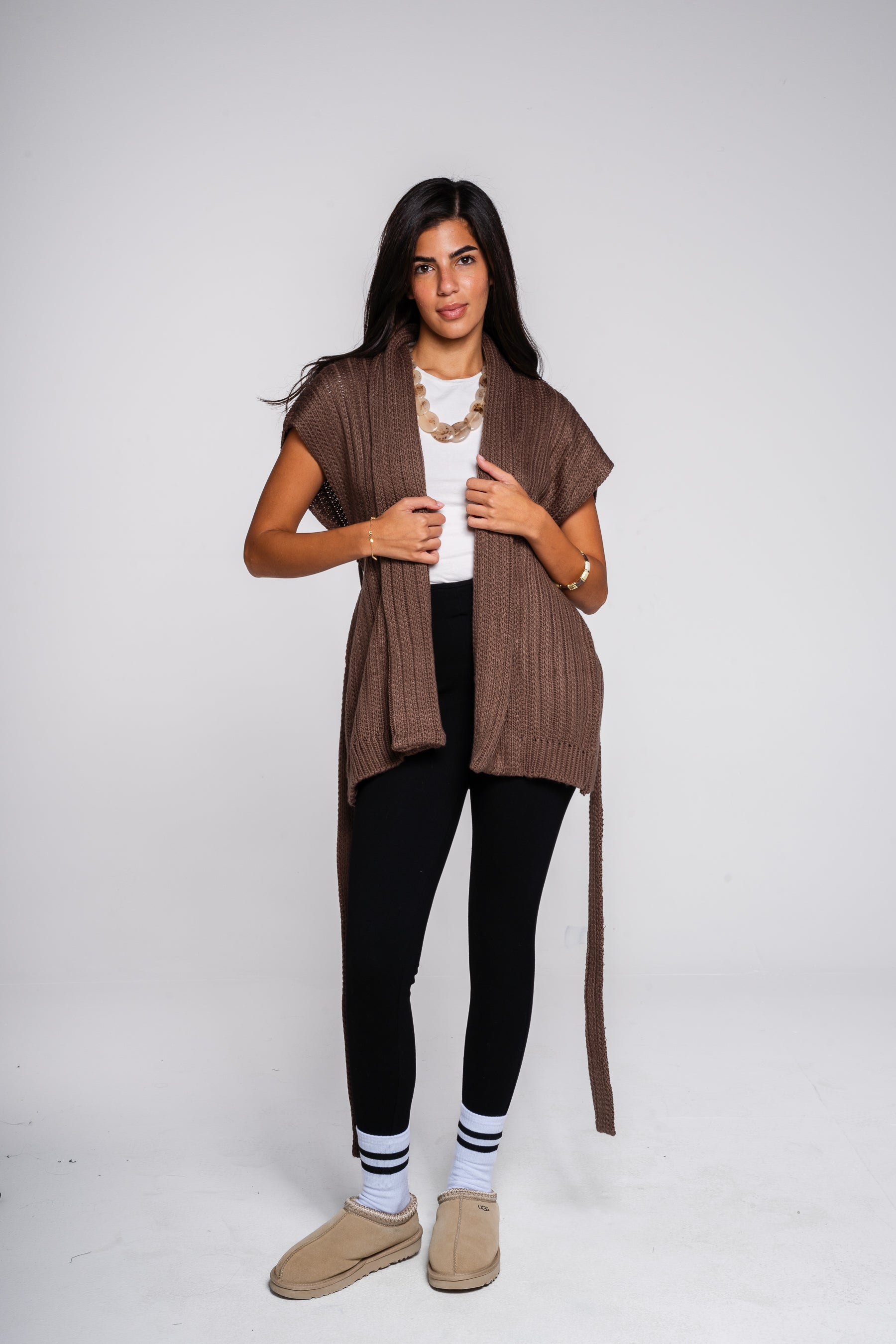 Go ahead, feel dramatic! This knit vest adds a sweeping, confident layer and lets you belt it exactly how you want it. Long knit vest with an adaptable tie-belt closure.