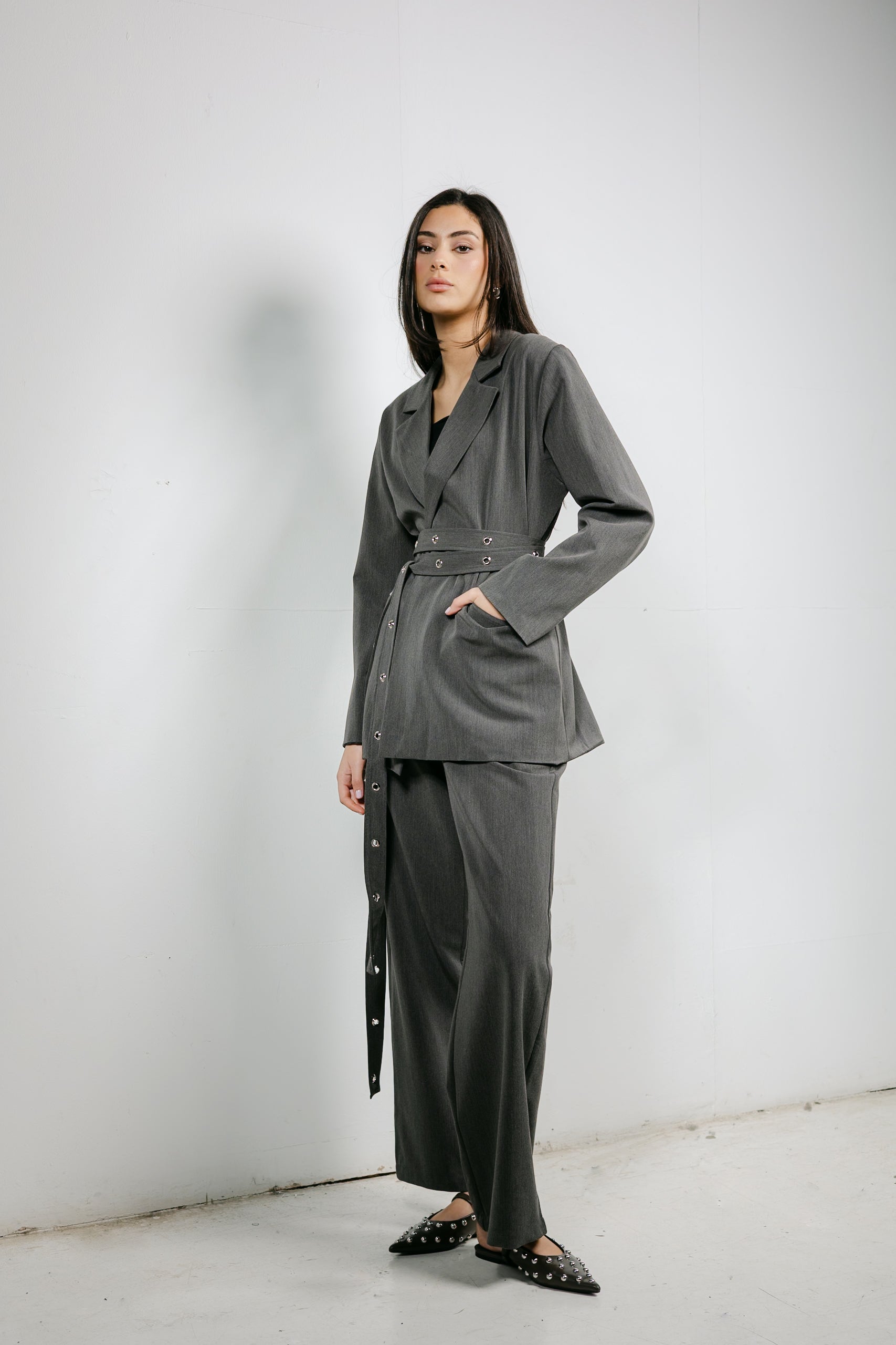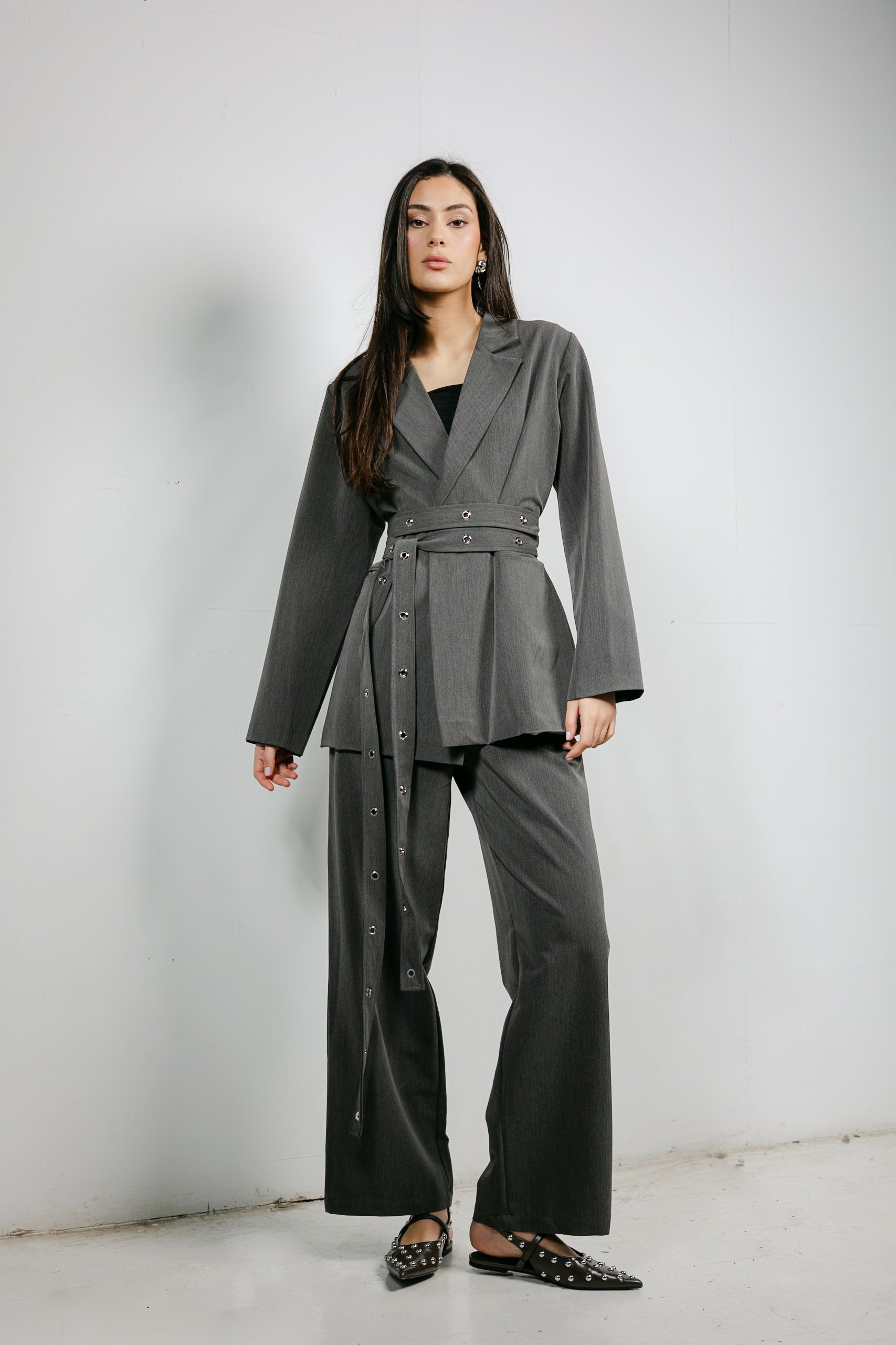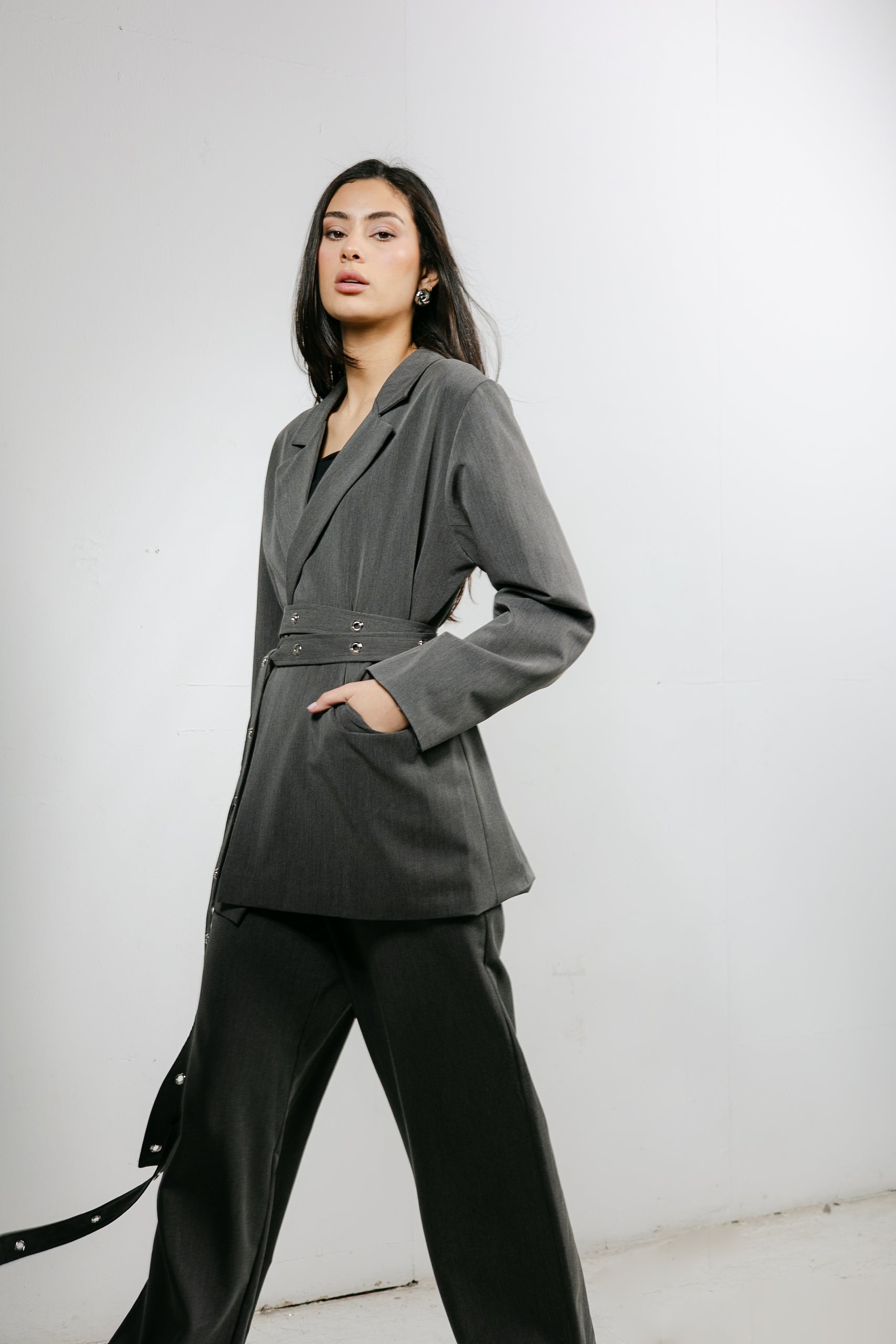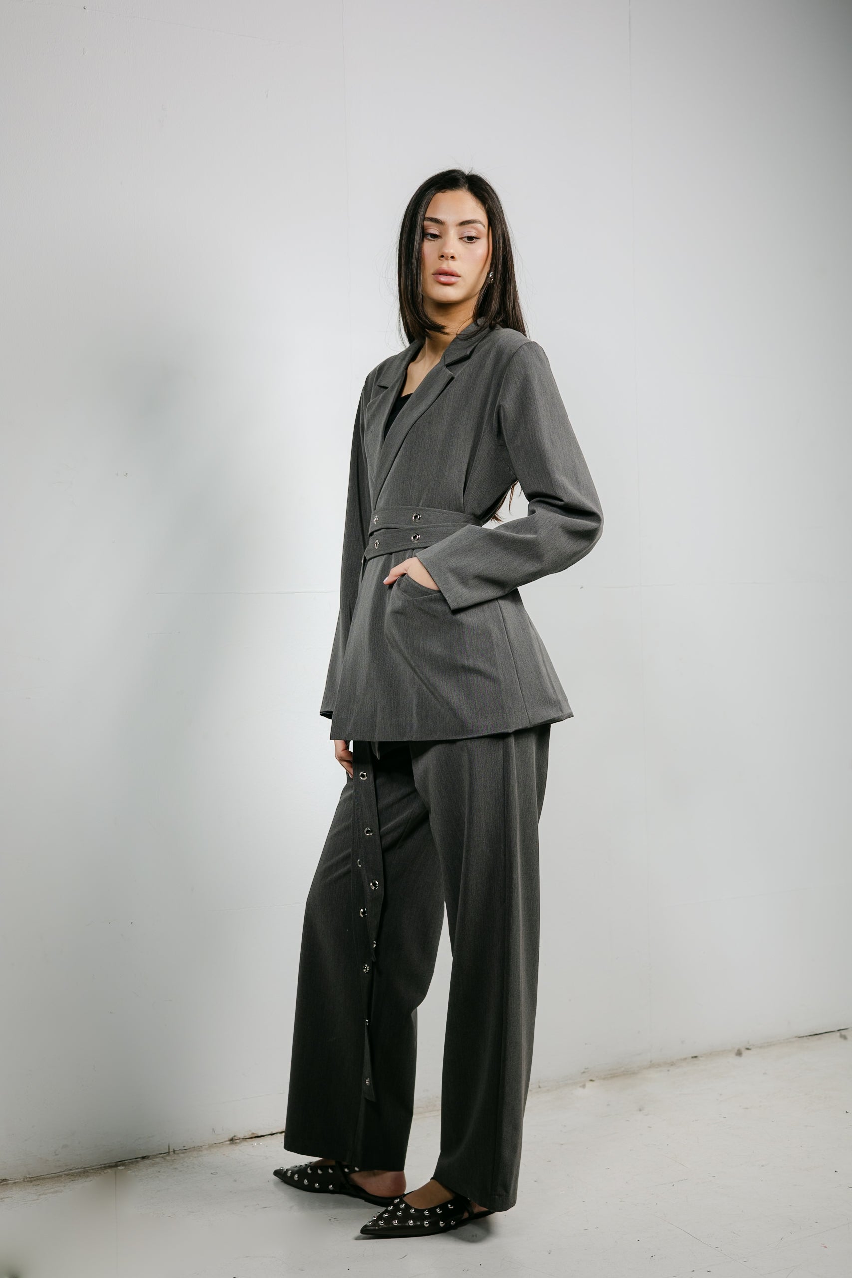 A stunning ensemble that blends professional tailoring with eye-catching flair. This set features unique metallic "Silver Bell" accents, making it perfect for the office or an event.