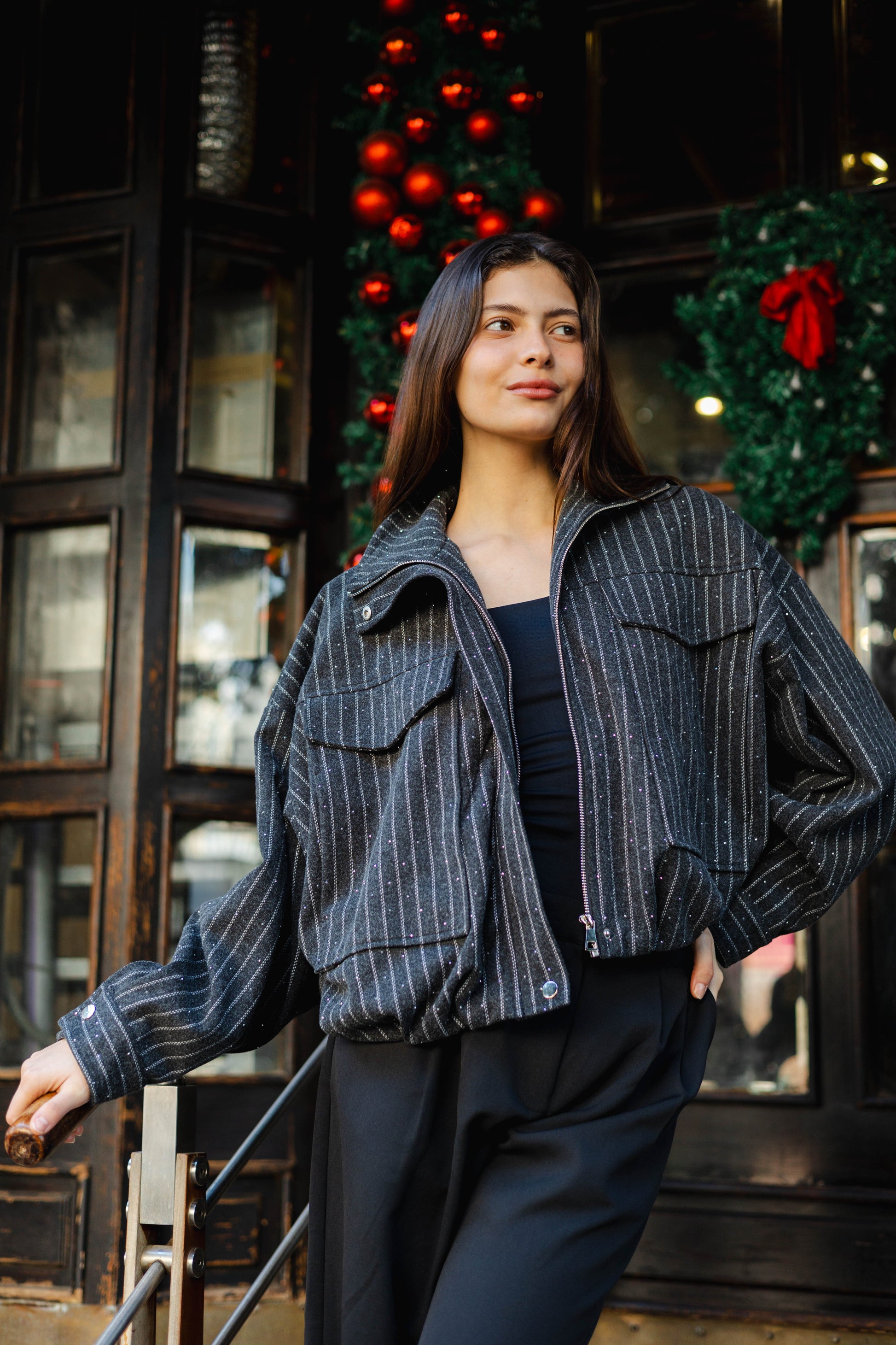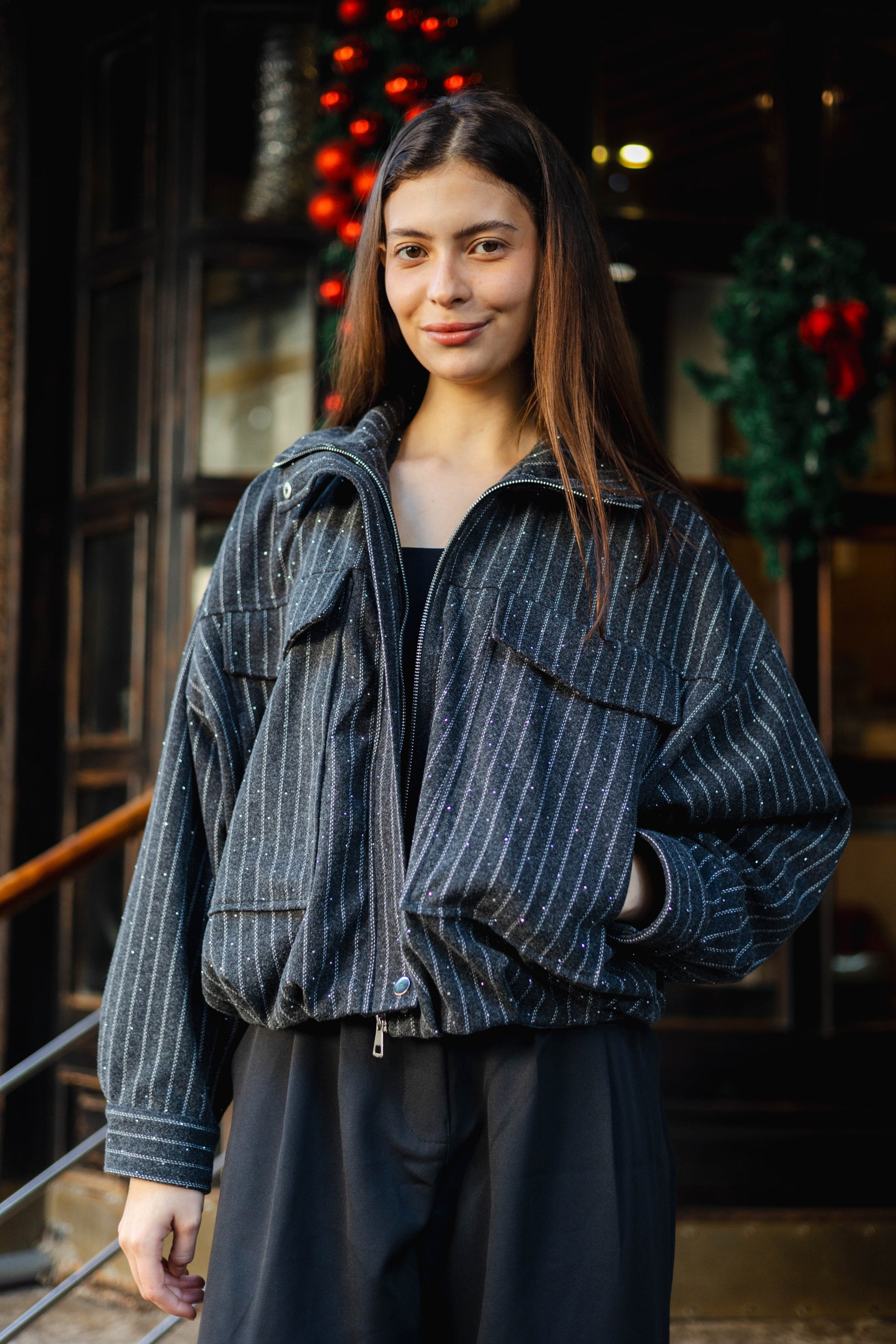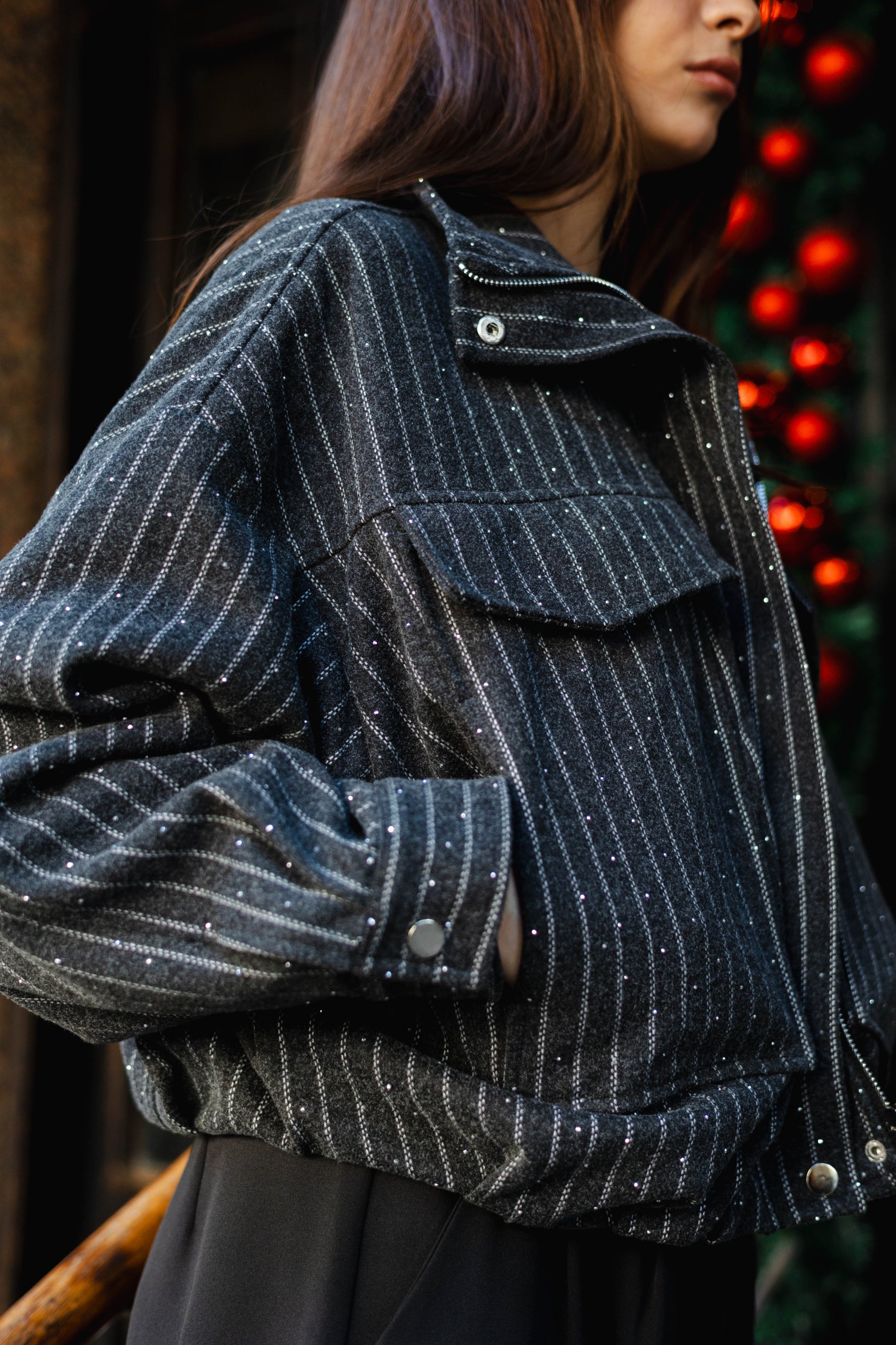 The Star Daze Jacket features a structured cropped fit with refined pinstripes and delicate shimmering details. This piece includes an oversized collar, and bold chest pockets for a modern edge. Available in rich Brown, Cafe, Dark Grey, and Burgundy to elevate any look.