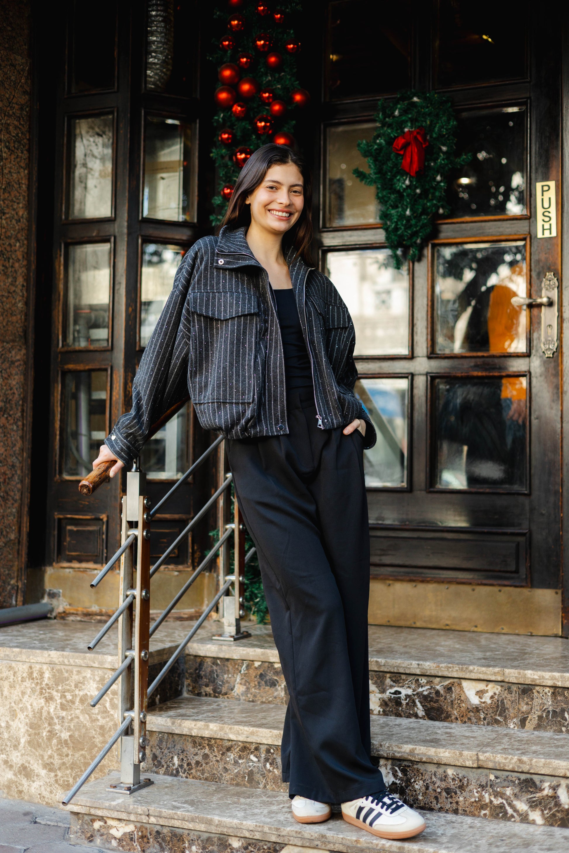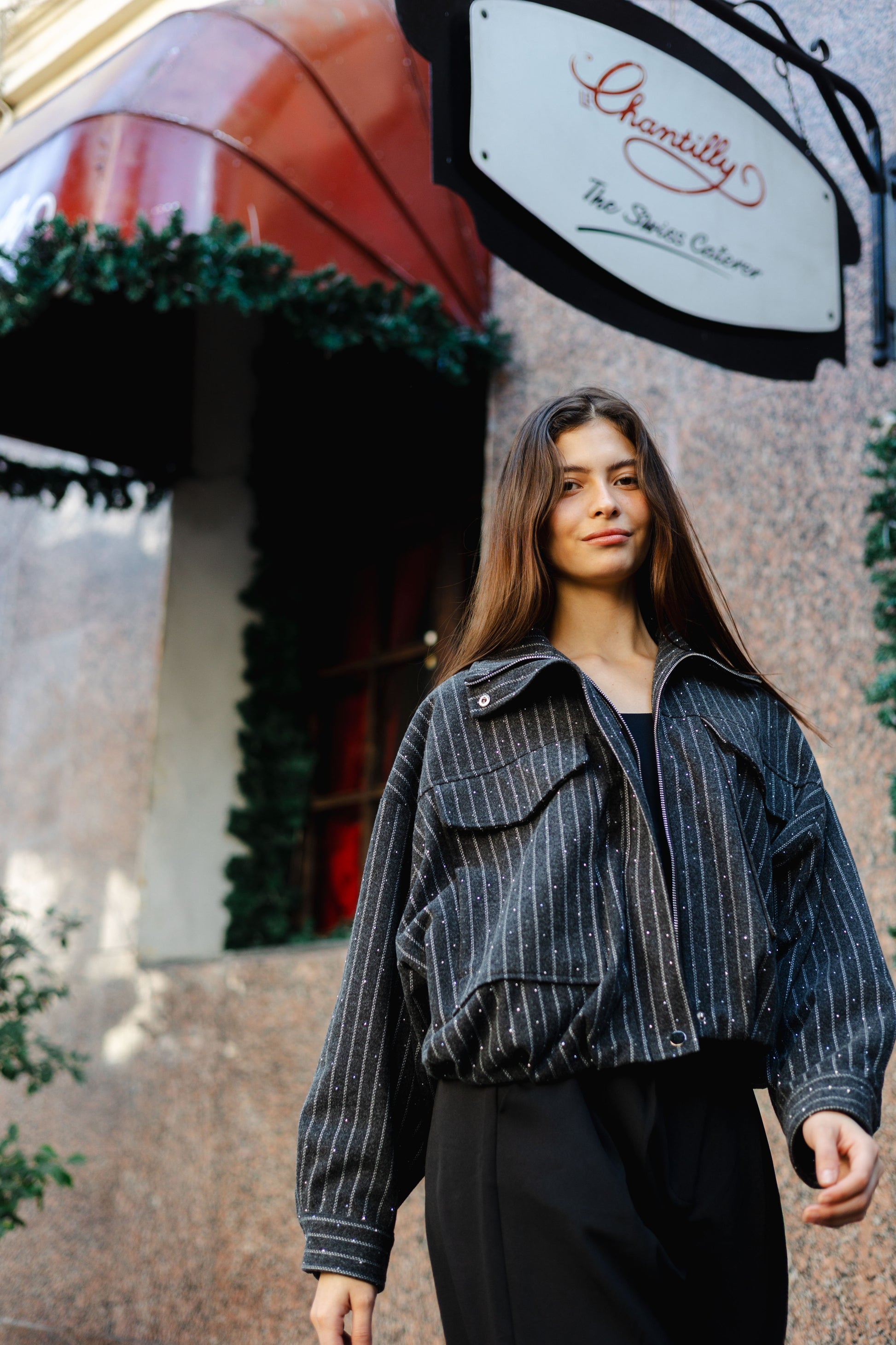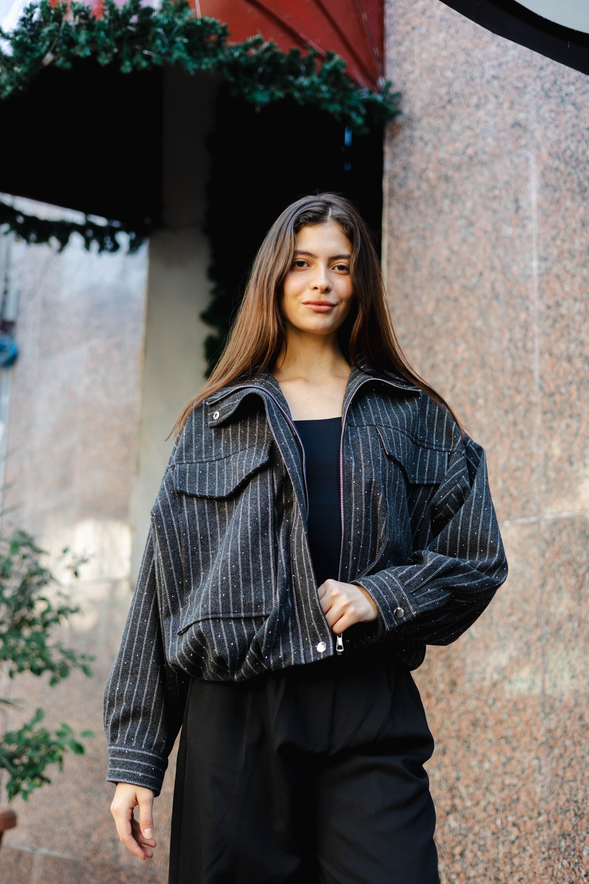 The Star Daze Jacket features a structured cropped fit with refined pinstripes and delicate shimmering details. This piece includes an oversized collar, and bold chest pockets for a modern edge. Available in rich Brown, Cafe, Dark Grey, and Burgundy to elevate any look.