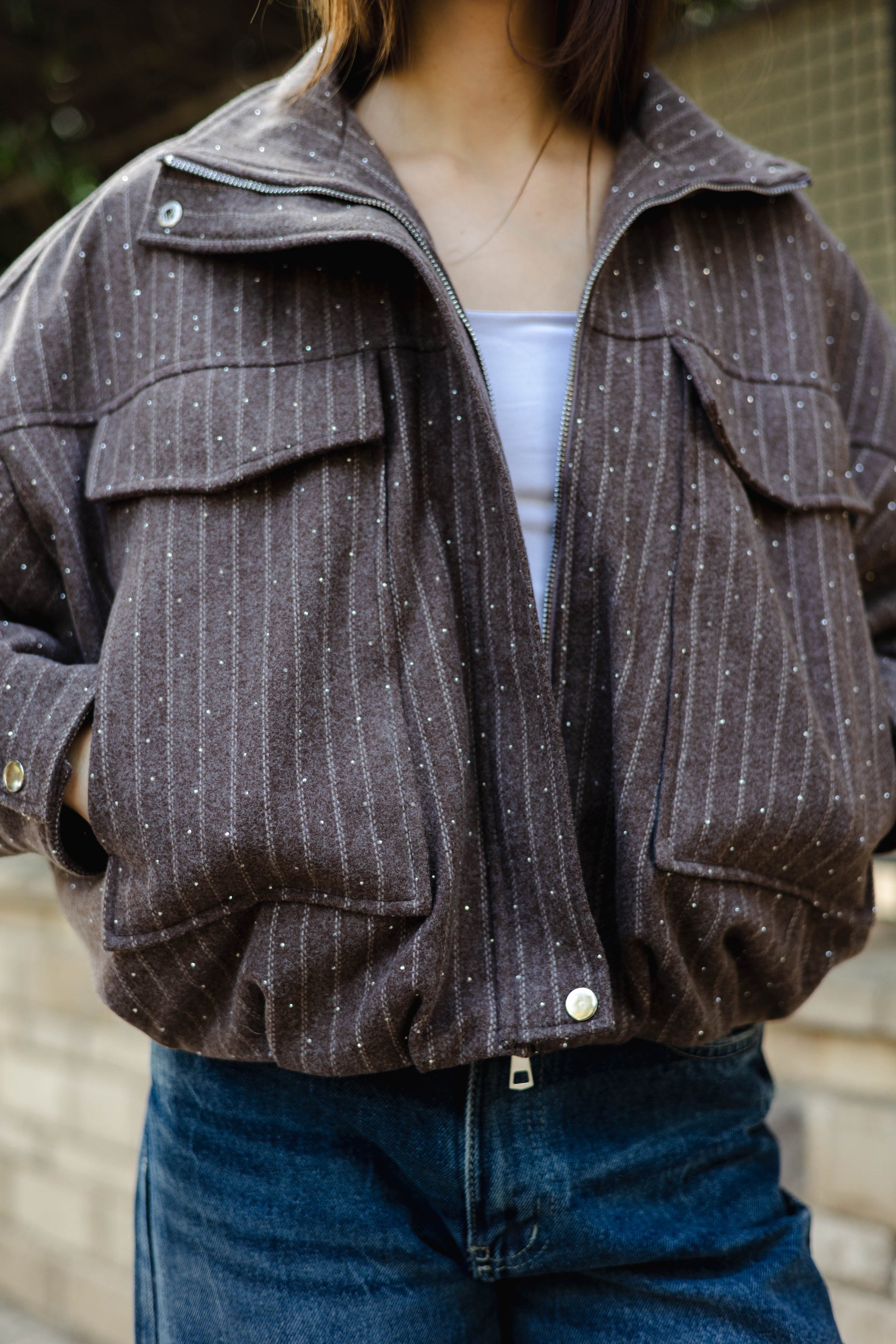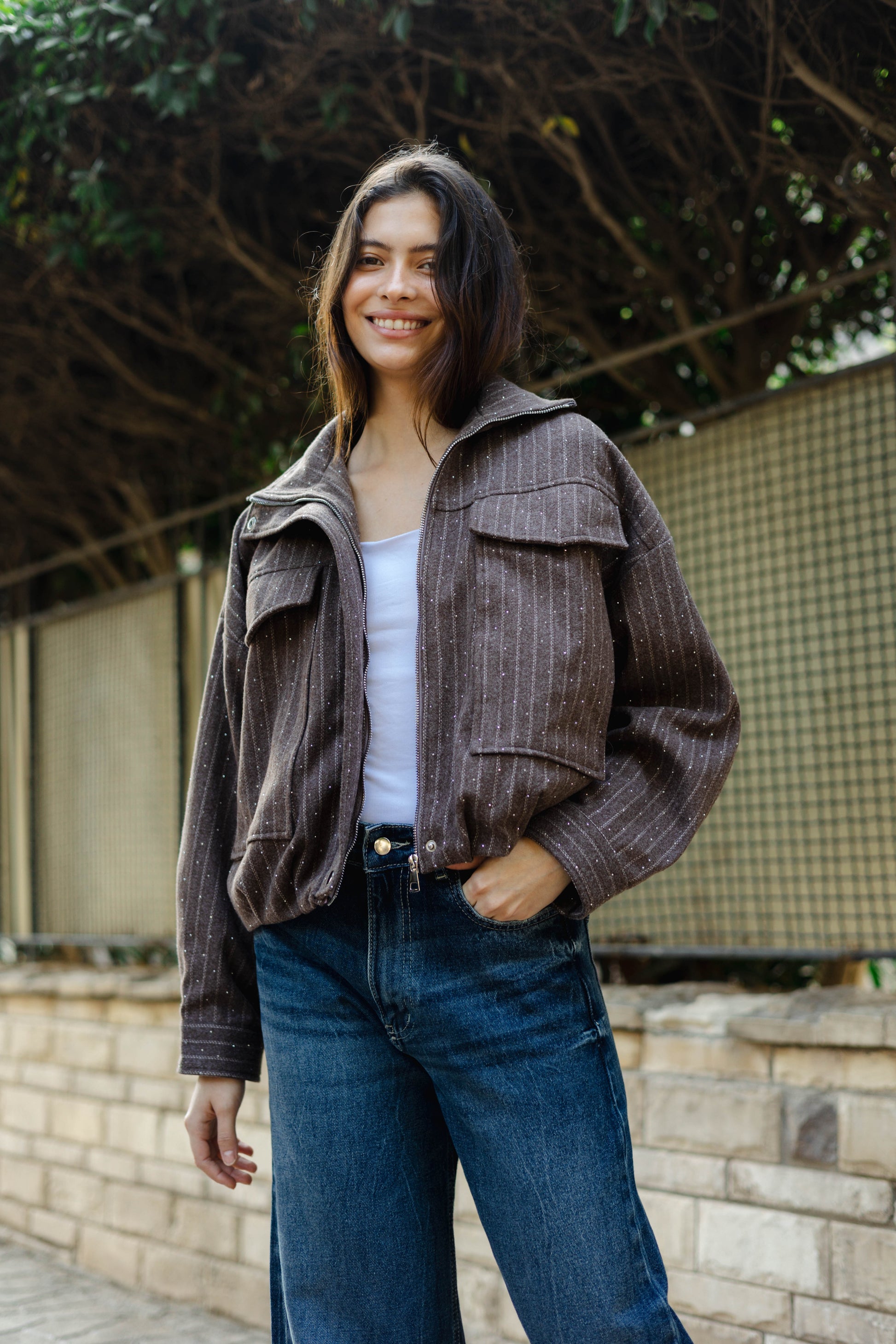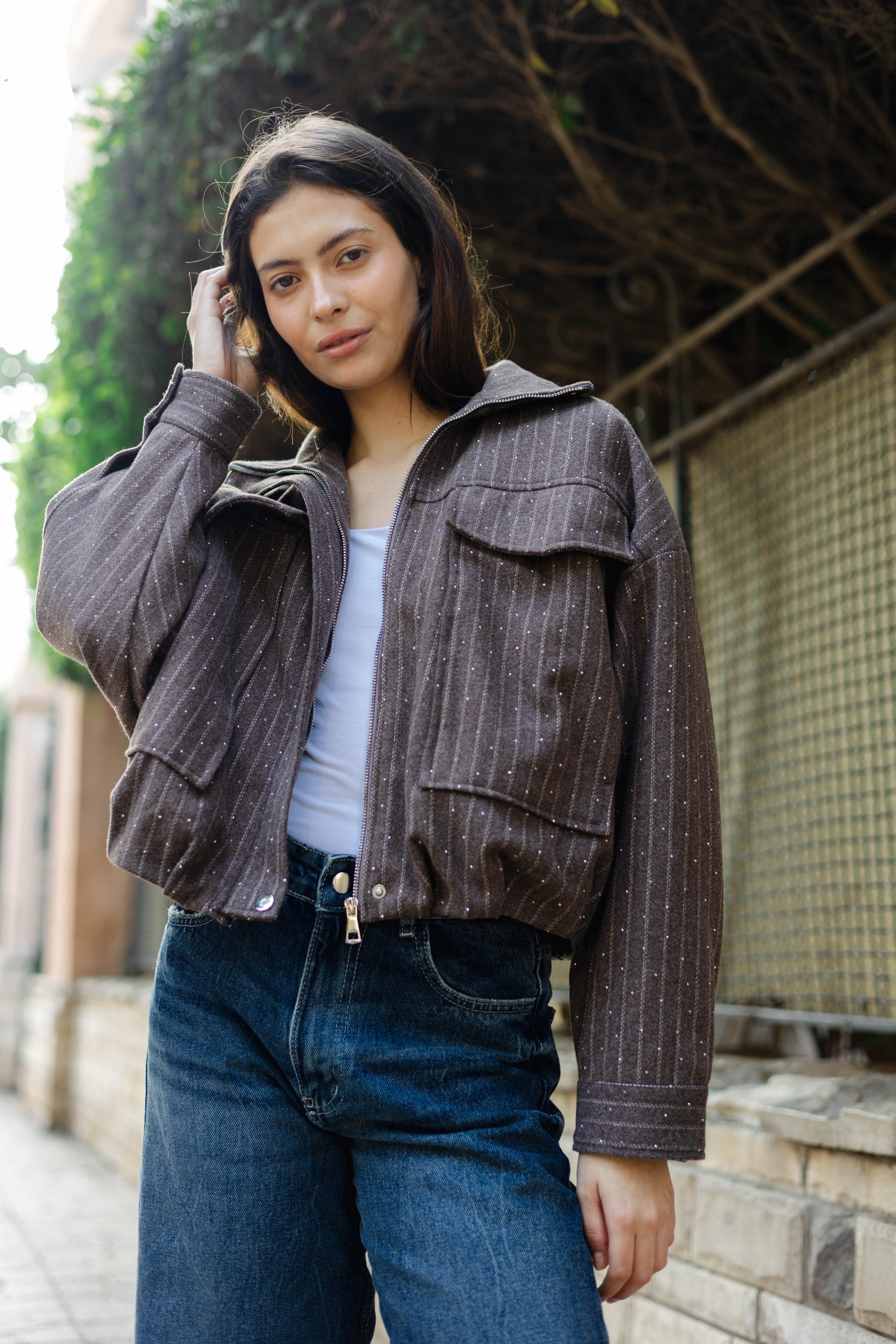 The Star Daze Jacket features a structured cropped fit with refined pinstripes and delicate shimmering details. This piece includes an oversized collar, and bold chest pockets for a modern edge. Available in rich Brown, Cafe, Dark Grey, and Burgundy to elevate any look.