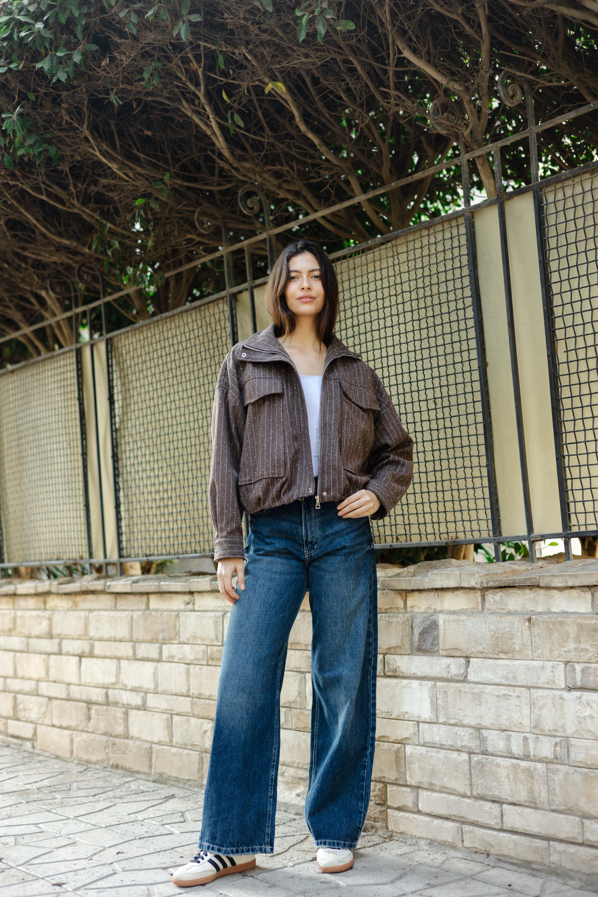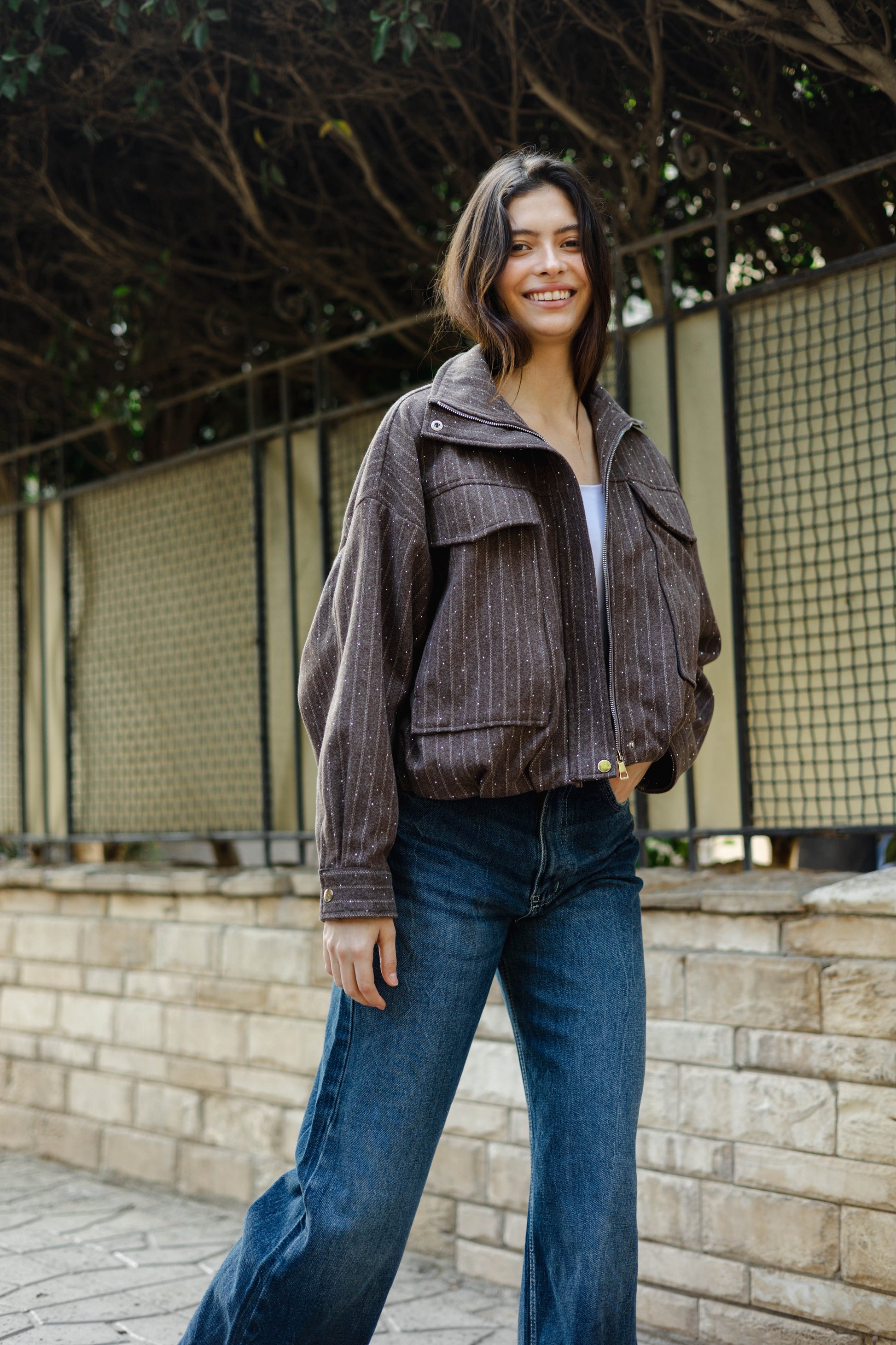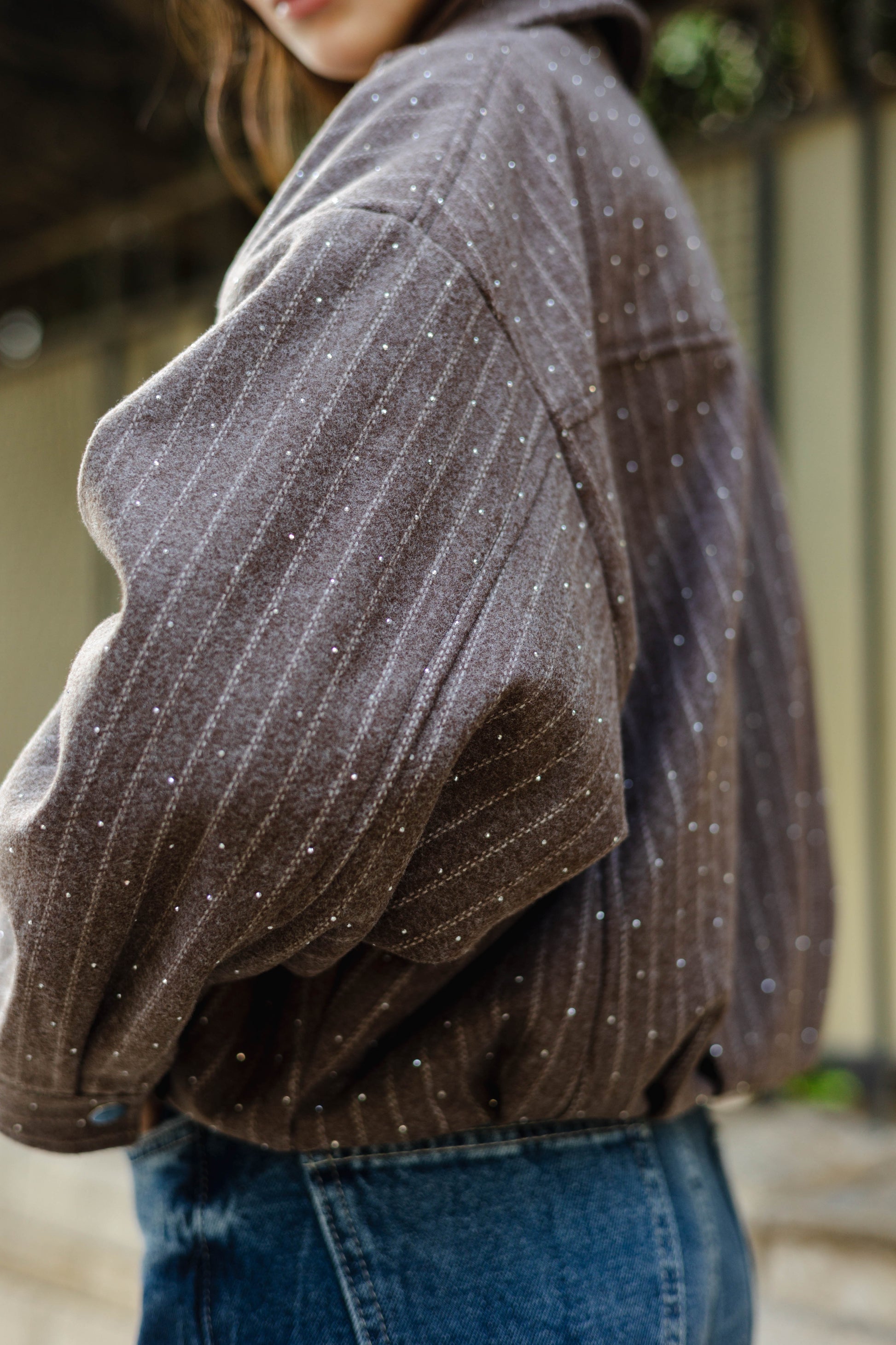 The Star Daze Jacket features a structured cropped fit with refined pinstripes and delicate shimmering details. This piece includes an oversized collar, and bold chest pockets for a modern edge. Available in rich Brown, Cafe, Dark Grey, and Burgundy to elevate any look.