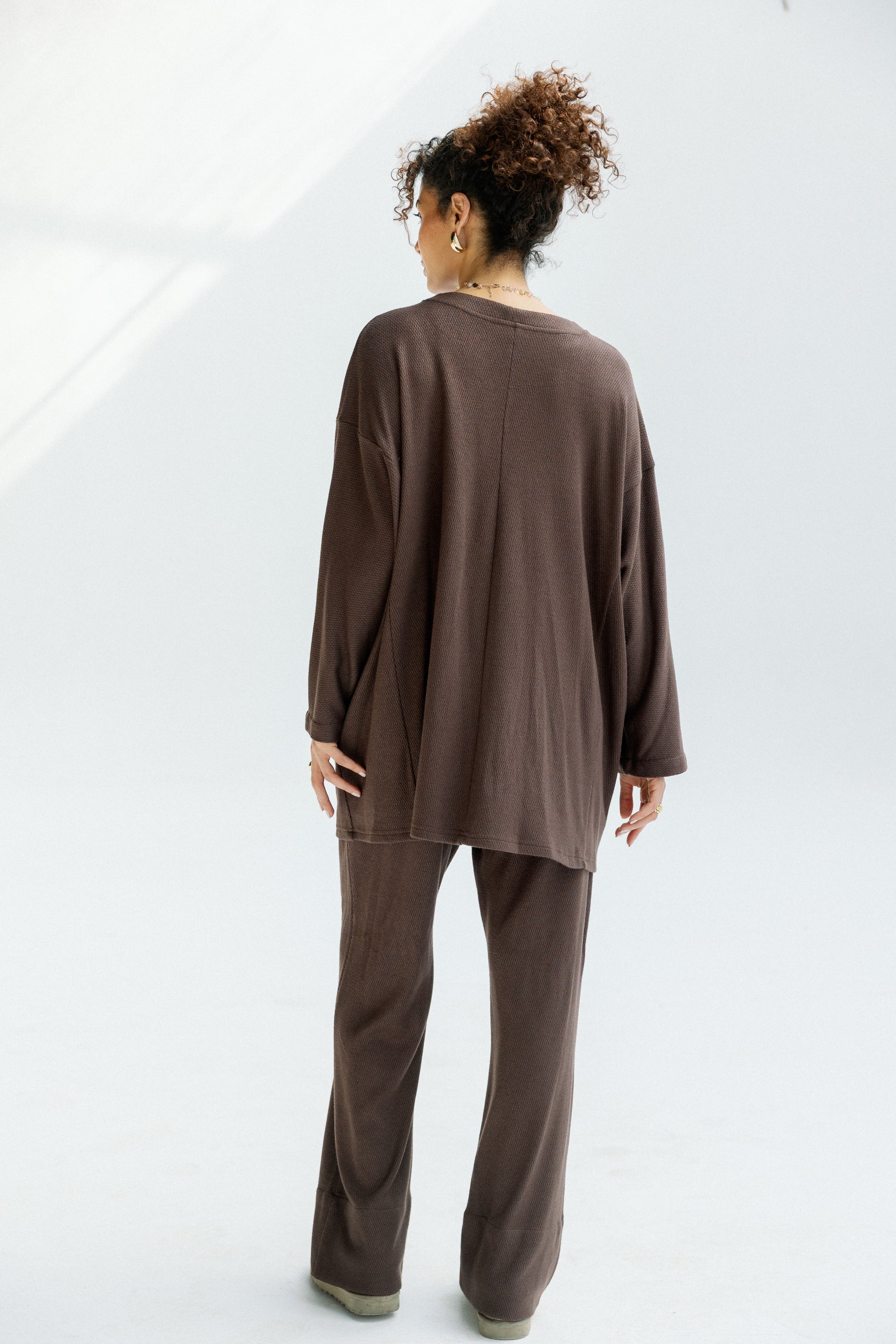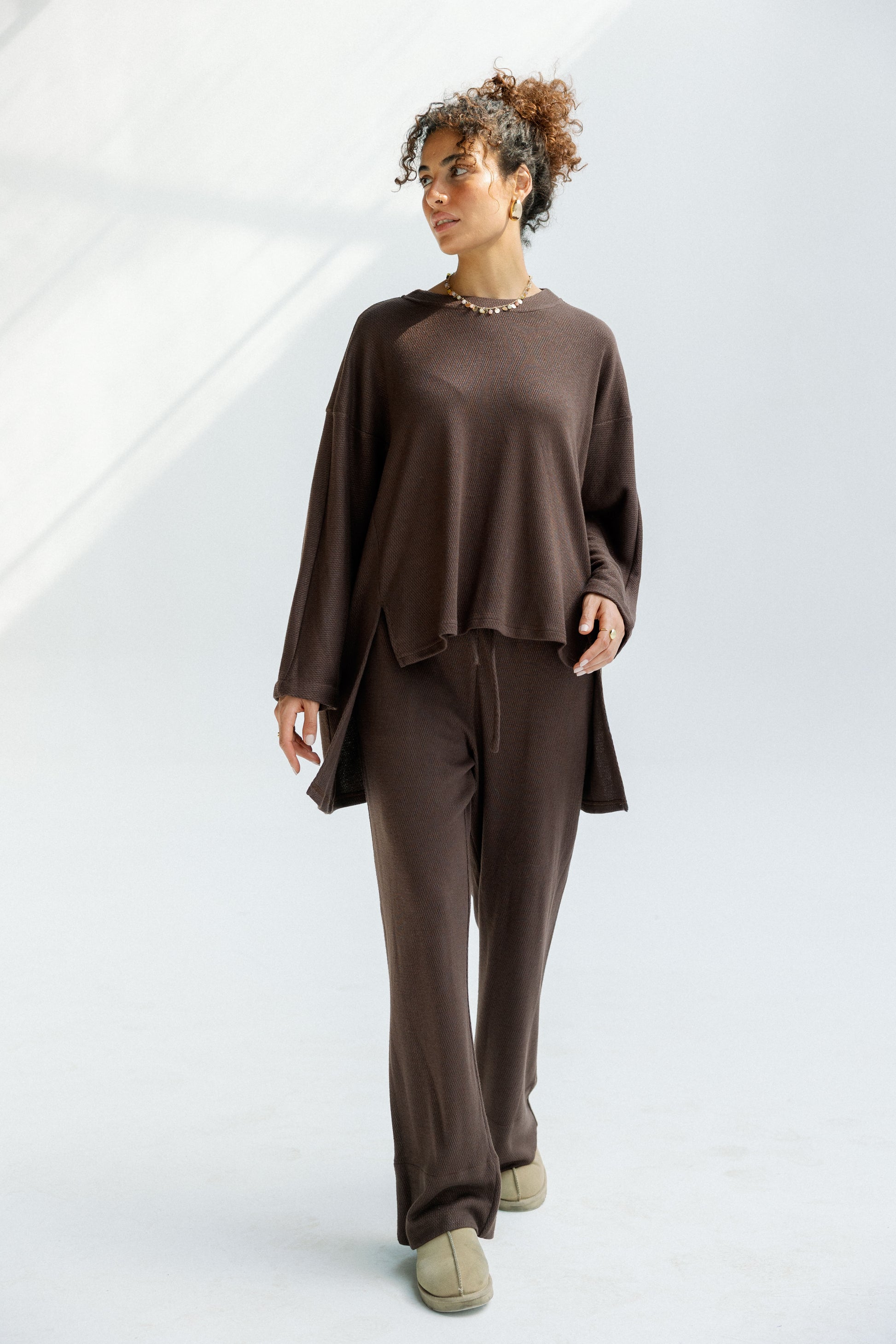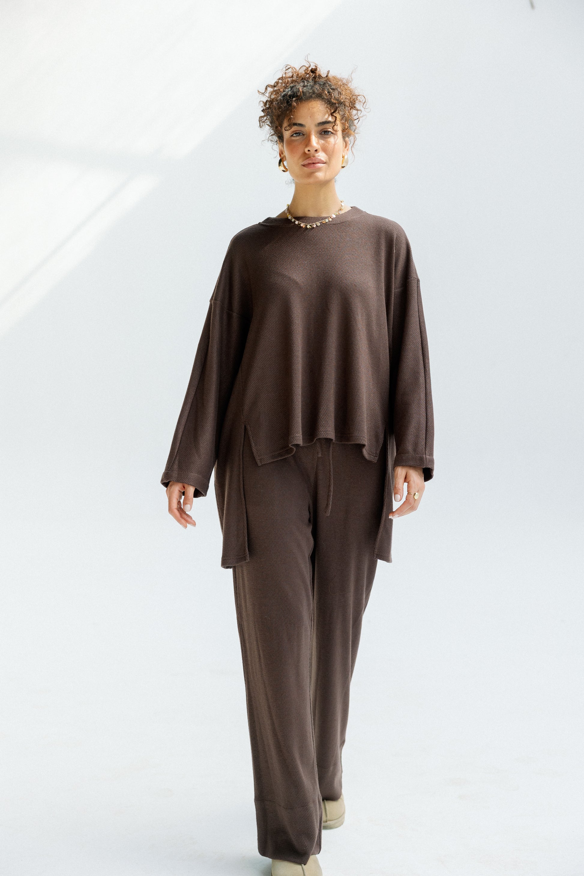 Soft elegance for every occasion — The Glimmer Set includes a relaxed top and matching pants in a silky knit finish. Available in Off-White, Black, Brown, and Beige.