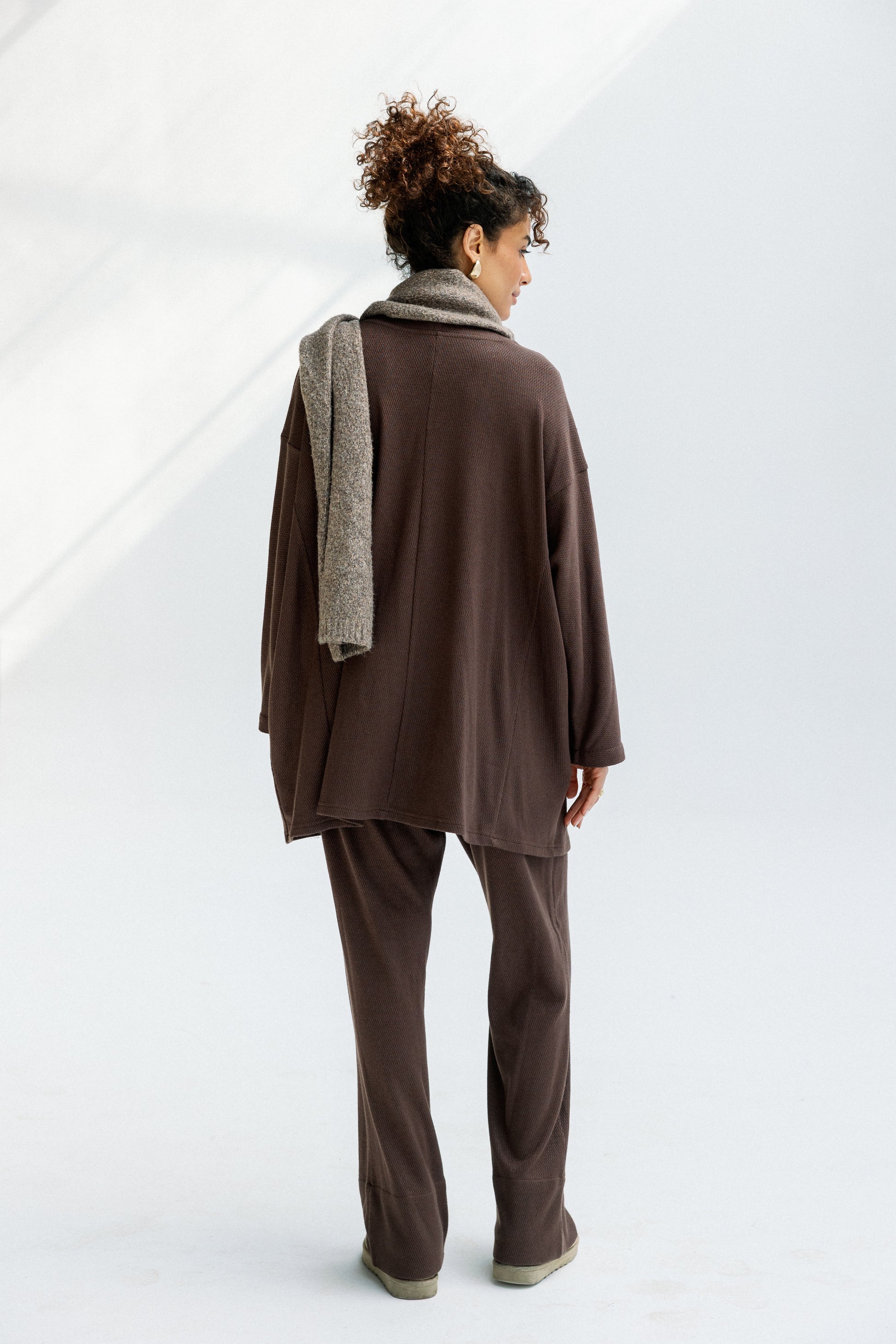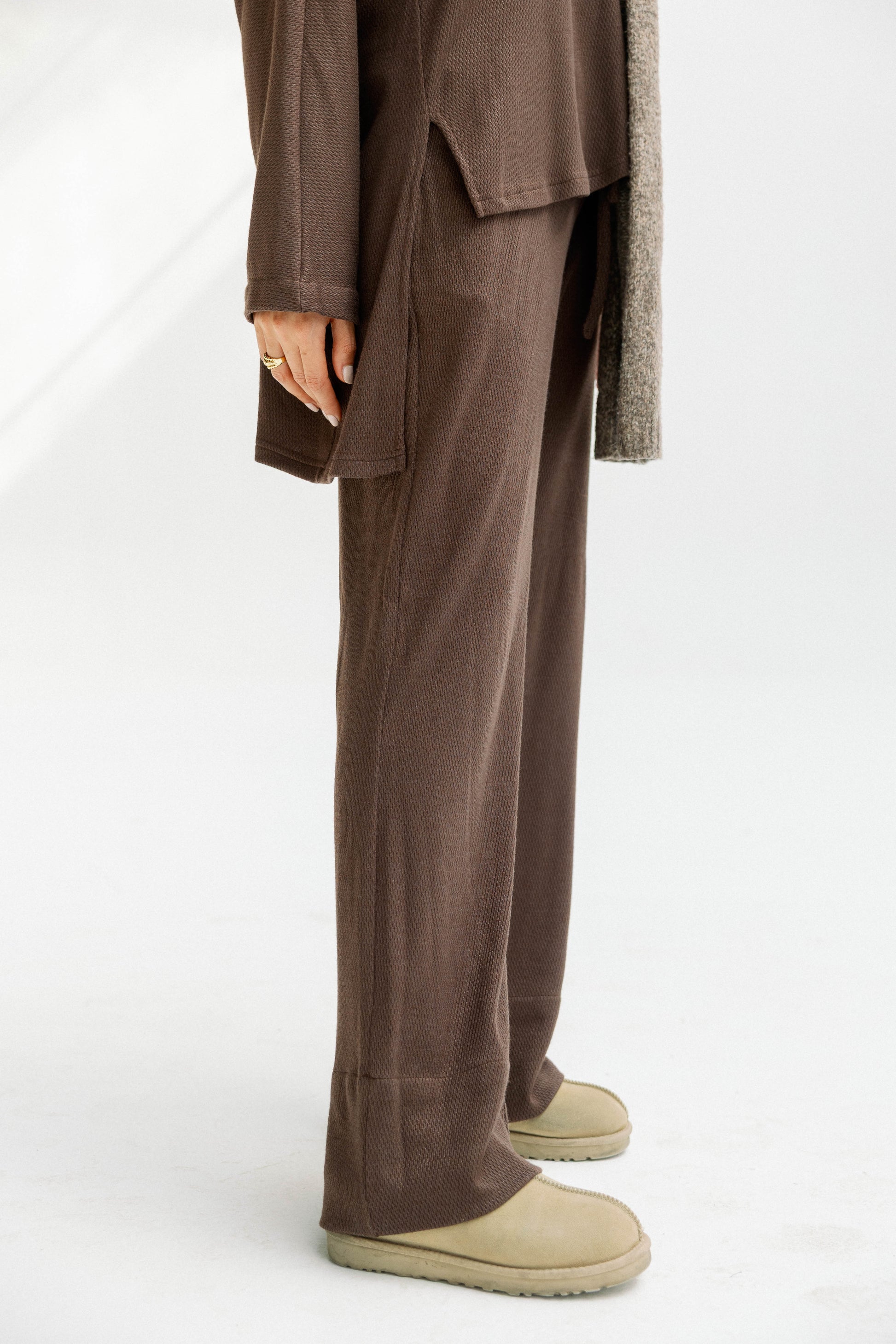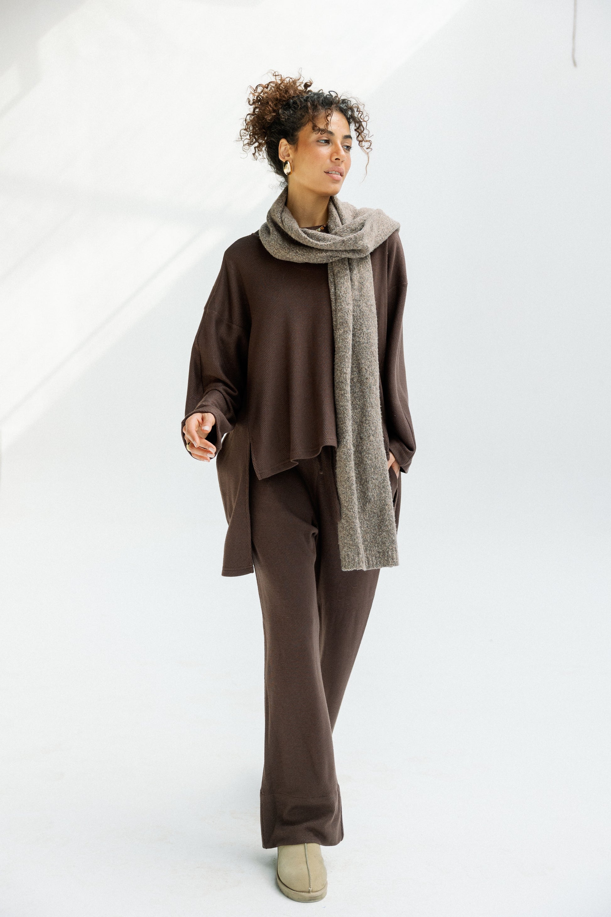 Soft elegance for every occasion — The Glimmer Set includes a relaxed top and matching pants in a silky knit finish. Available in Off-White, Black, Brown, and Beige.